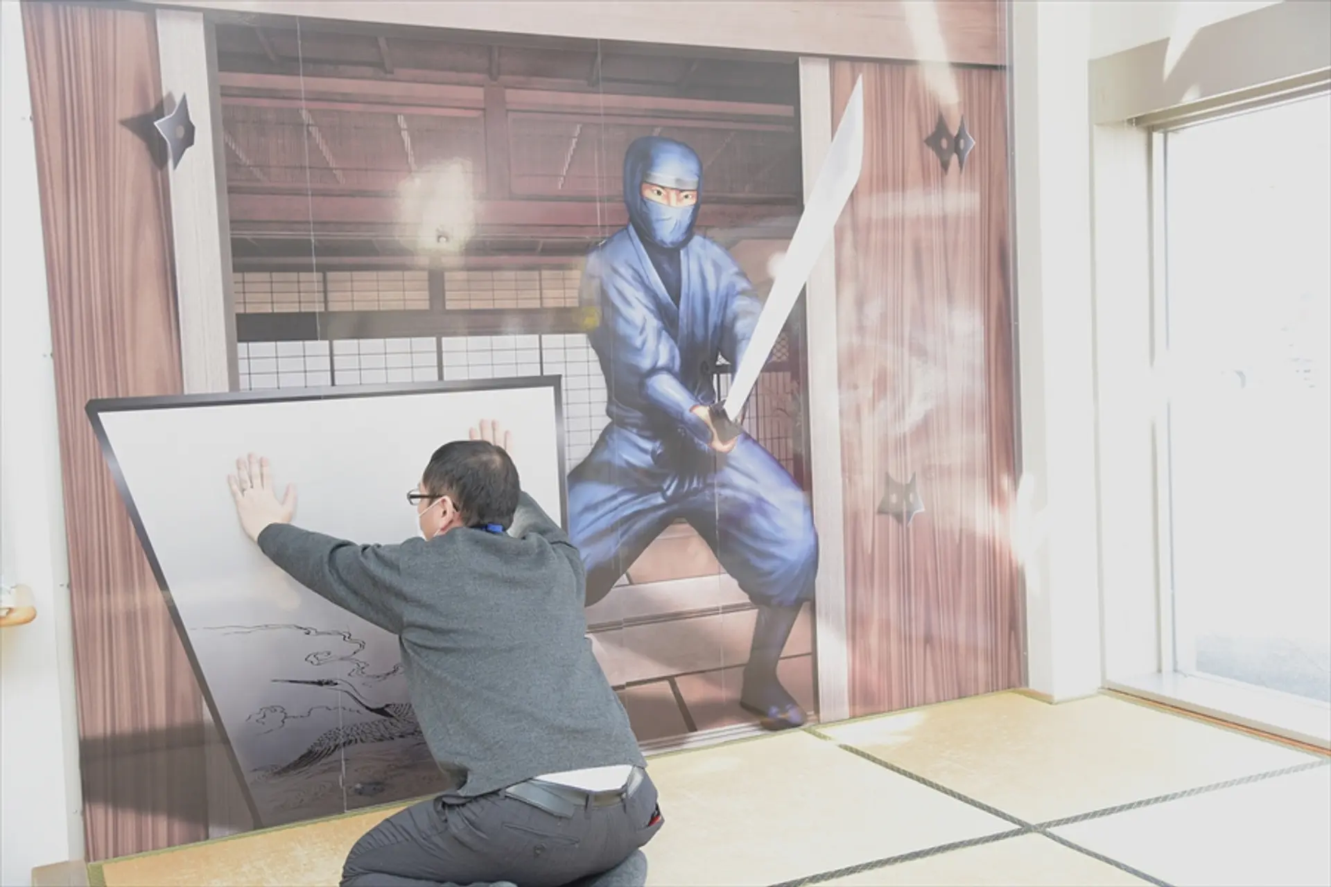 隣りにある建物「情報休憩室」の中にあるだまし絵。倒れてきた!?ふすまを支えているのが、北川店長です。