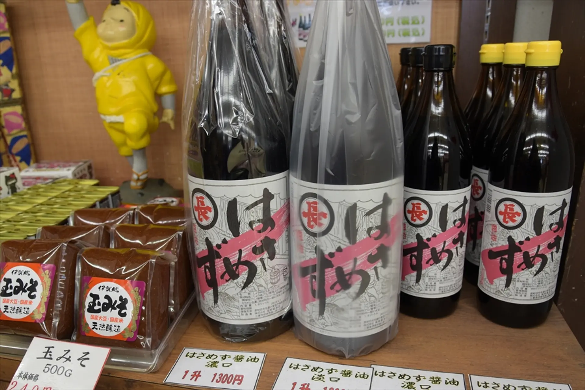 箸で挟めない「はさめず」は伊賀の有名なお醤油。こいいろとうすいろが並んでいて、一升瓶各1,300円、5合各810円。