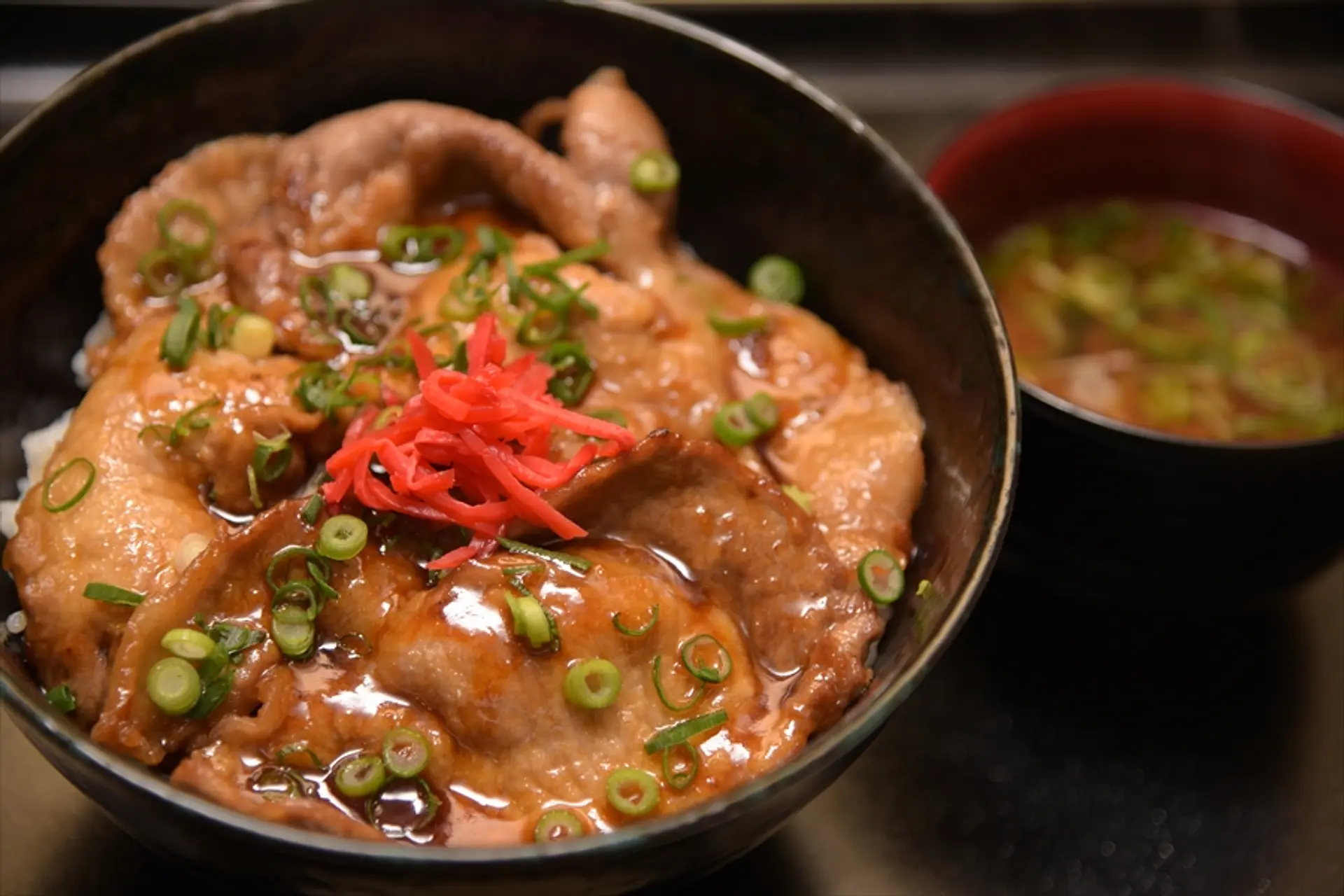 今回の取材で初めて食べたのですが、先ほどお伝えした良いこと尽くし、そのままの味わいでした!特製のステーキソース仕立ての「忍茶豚丼」。みそ汁付き830円、ミニうどん付き950円。