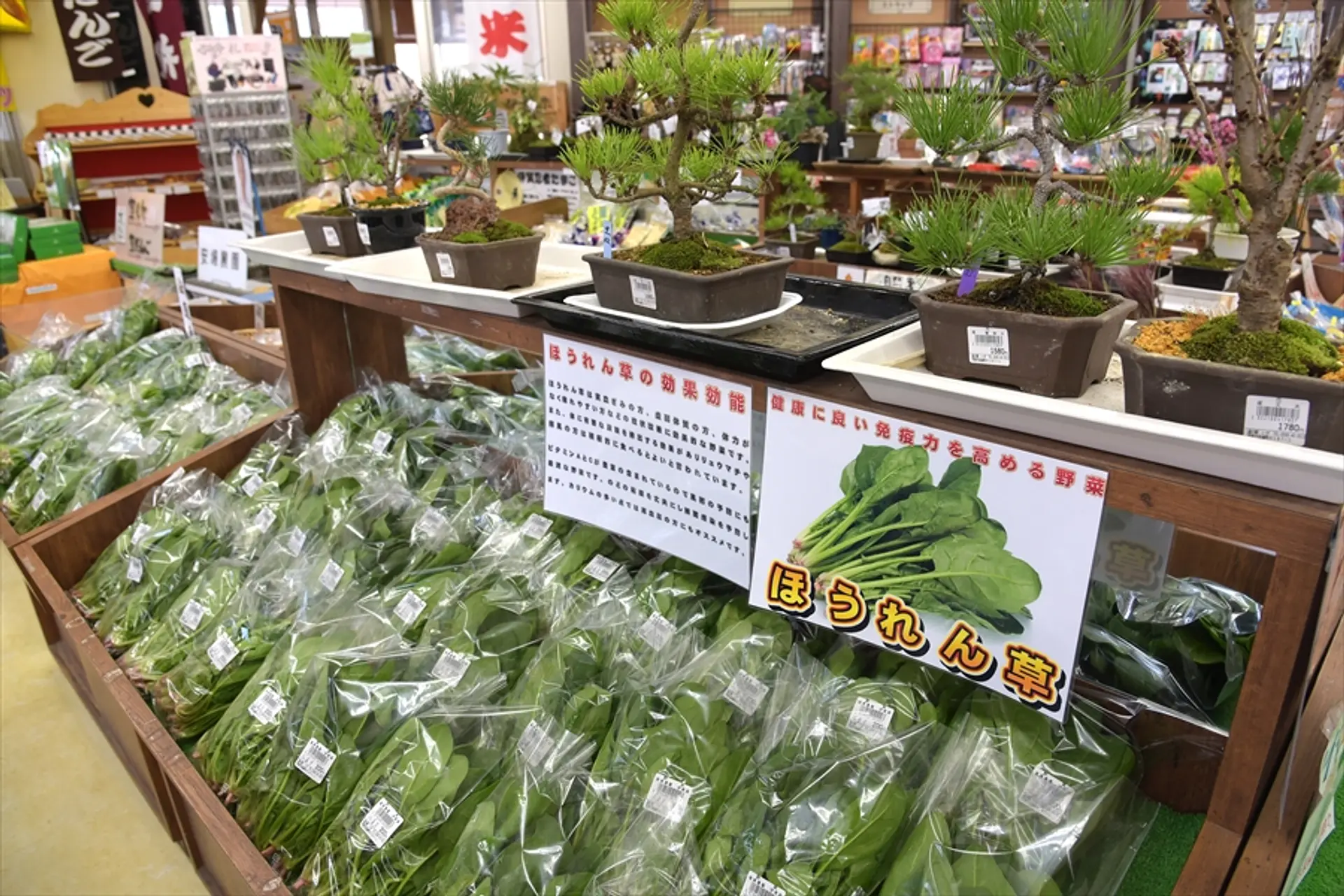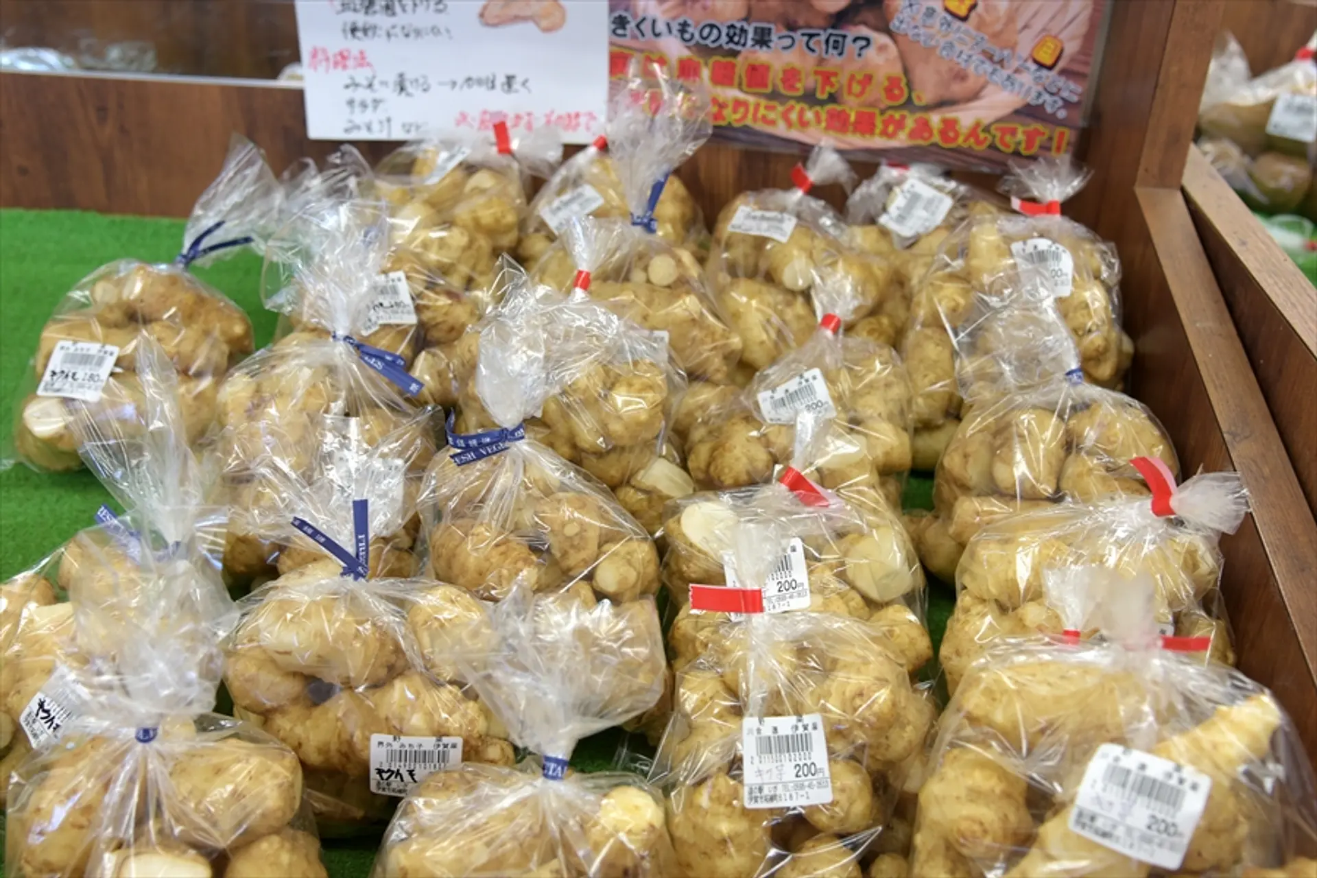地場産の野菜も並びます。中でもおすすめの「菊芋」は、血糖値を下げる、お通じに良いと言われています。