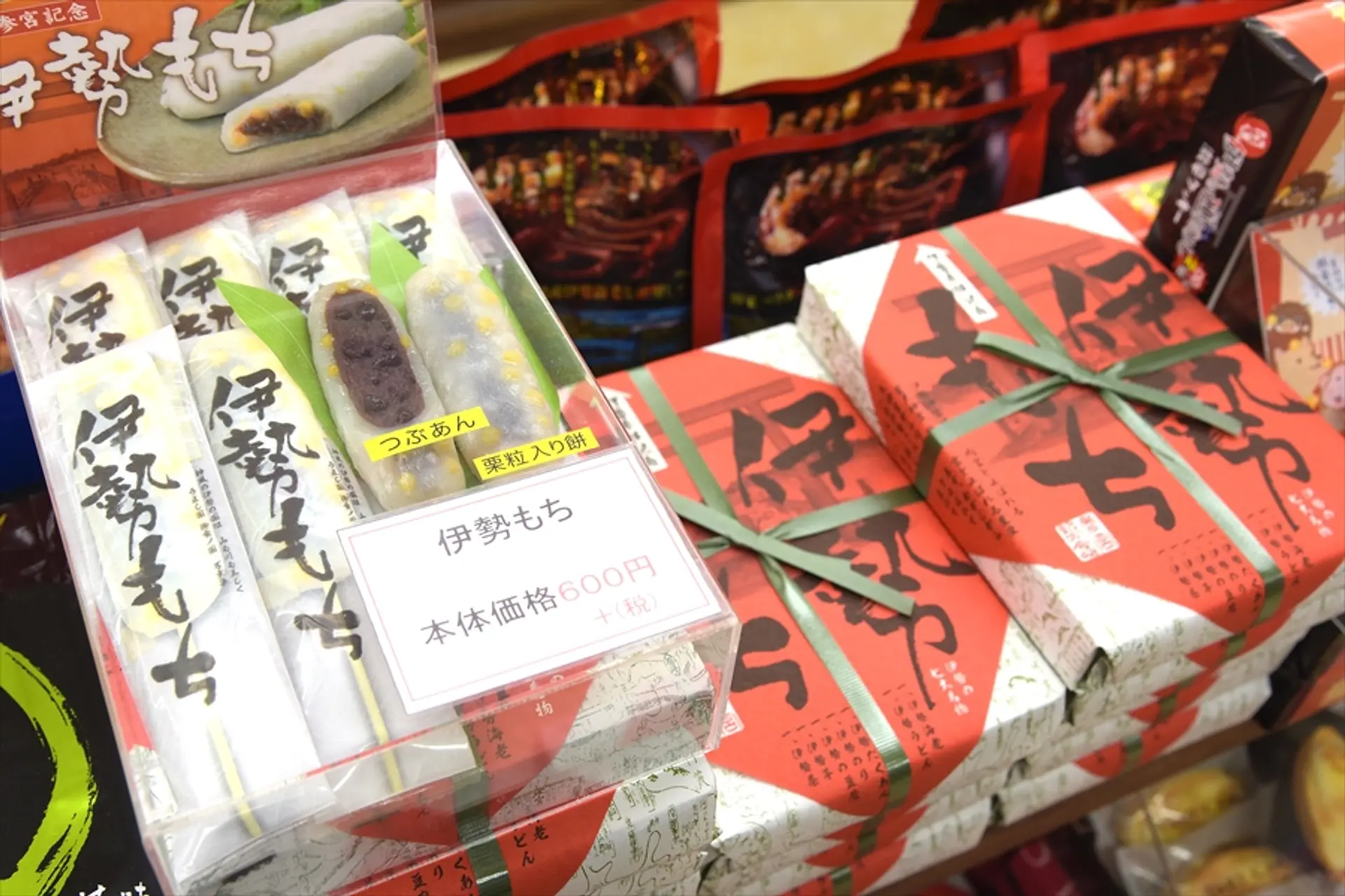 餅を串に刺したお菓子「伊勢もち」648円。細かく刻んだ栗の粒入りのお持ちの中に、つぶあんが入っています。