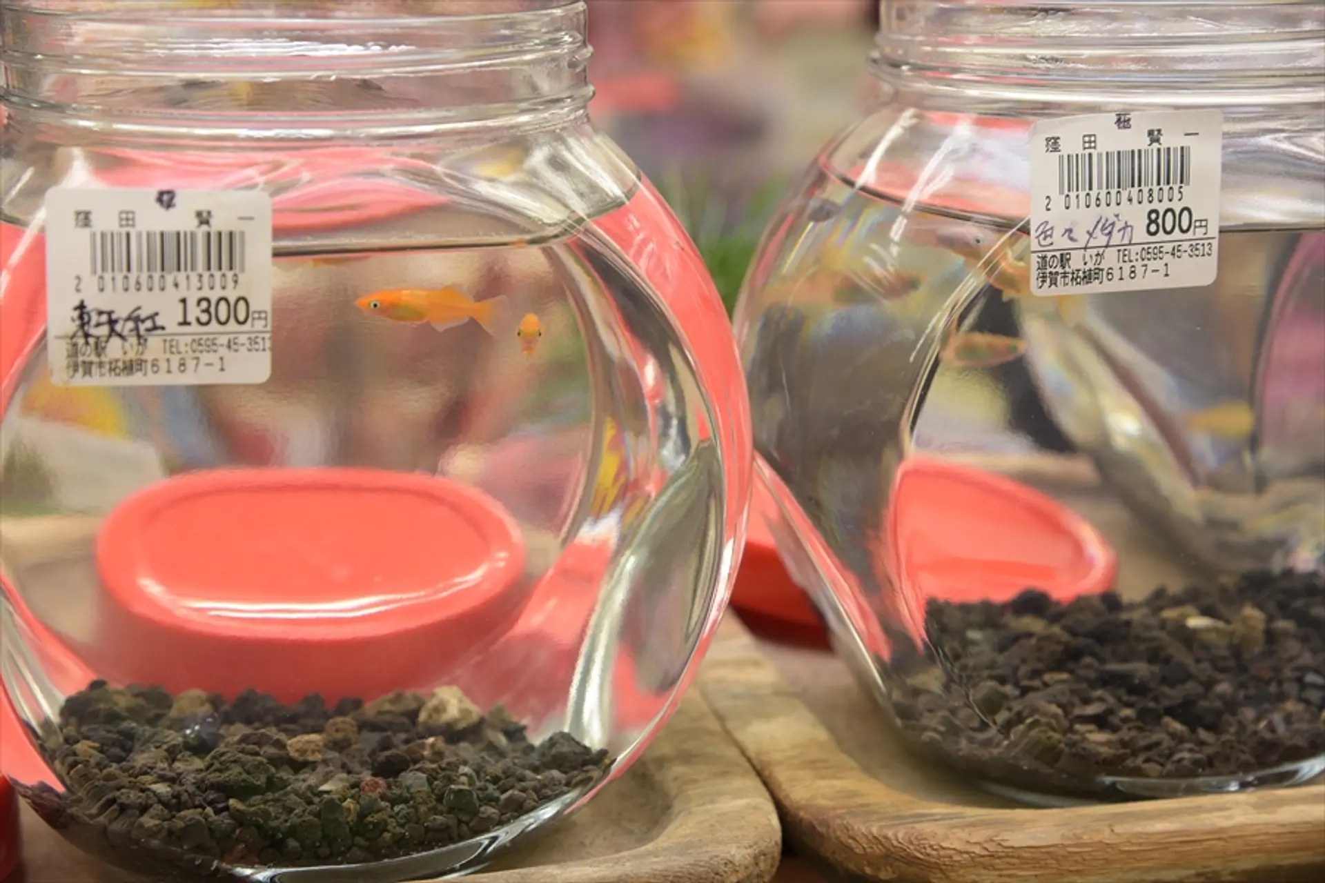 伊賀にメダカを養殖しているお店があるそうで、それぞれの鉢に二匹ずつのメダカが泳いでいました。