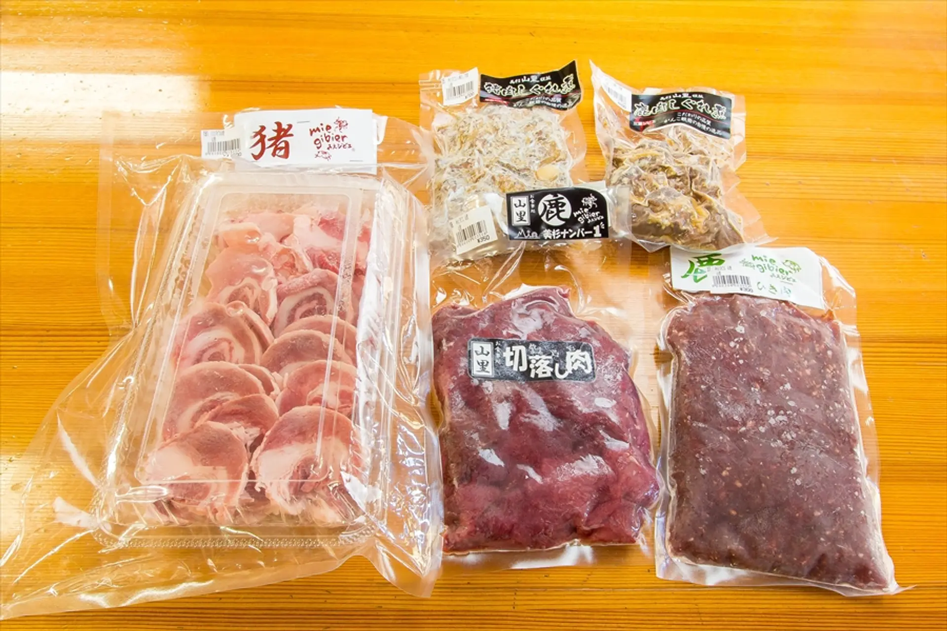 カレーやコロッケにするのはもちろん、臭みがないので焼肉にして味わう人もいるそうです。「みえジビエ 猪」1500円、「みえジビエ肉のしぐれ煮(猪肉)」700円、「みえジビエ肉のしぐれ煮(鹿肉)」600円、「みえジビエ 鹿肉切落し」350円、「みえジビエ鹿肉 ひき肉」300円。