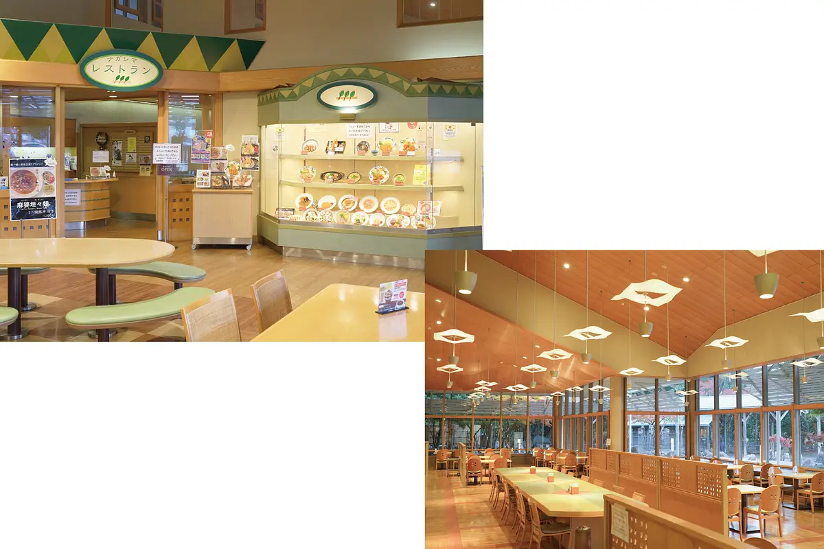 上り、下り共に長島温泉「ホテル 花水木」で味わえるメニューが勢揃い!ホテル内にあるような広々とした落ち着いた雰囲気の中でゆっくり食事が楽しめます。