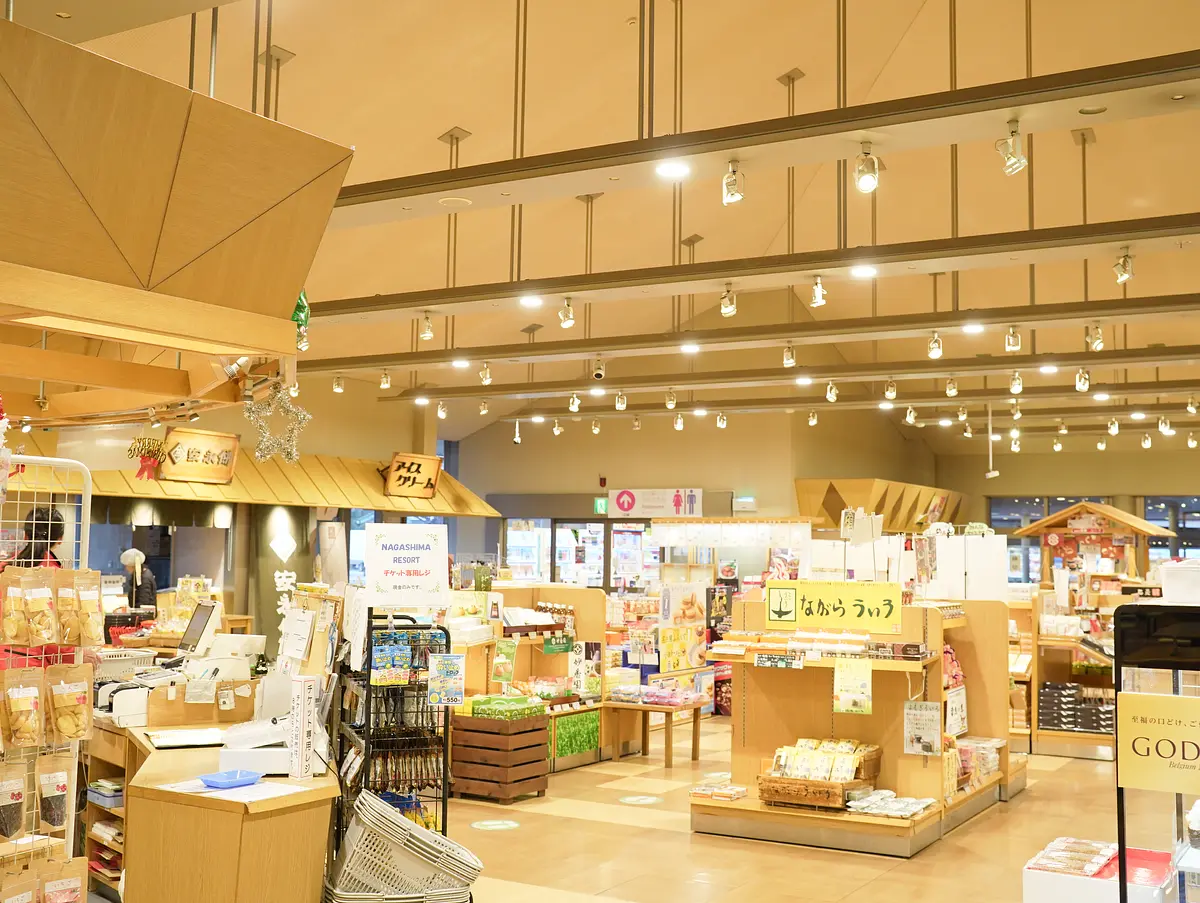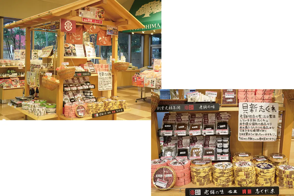 桑名の特産品コーナーには、はまぐりや貝しぐれなど、地元の味を楽しめる商品が豊富に並んでいます。