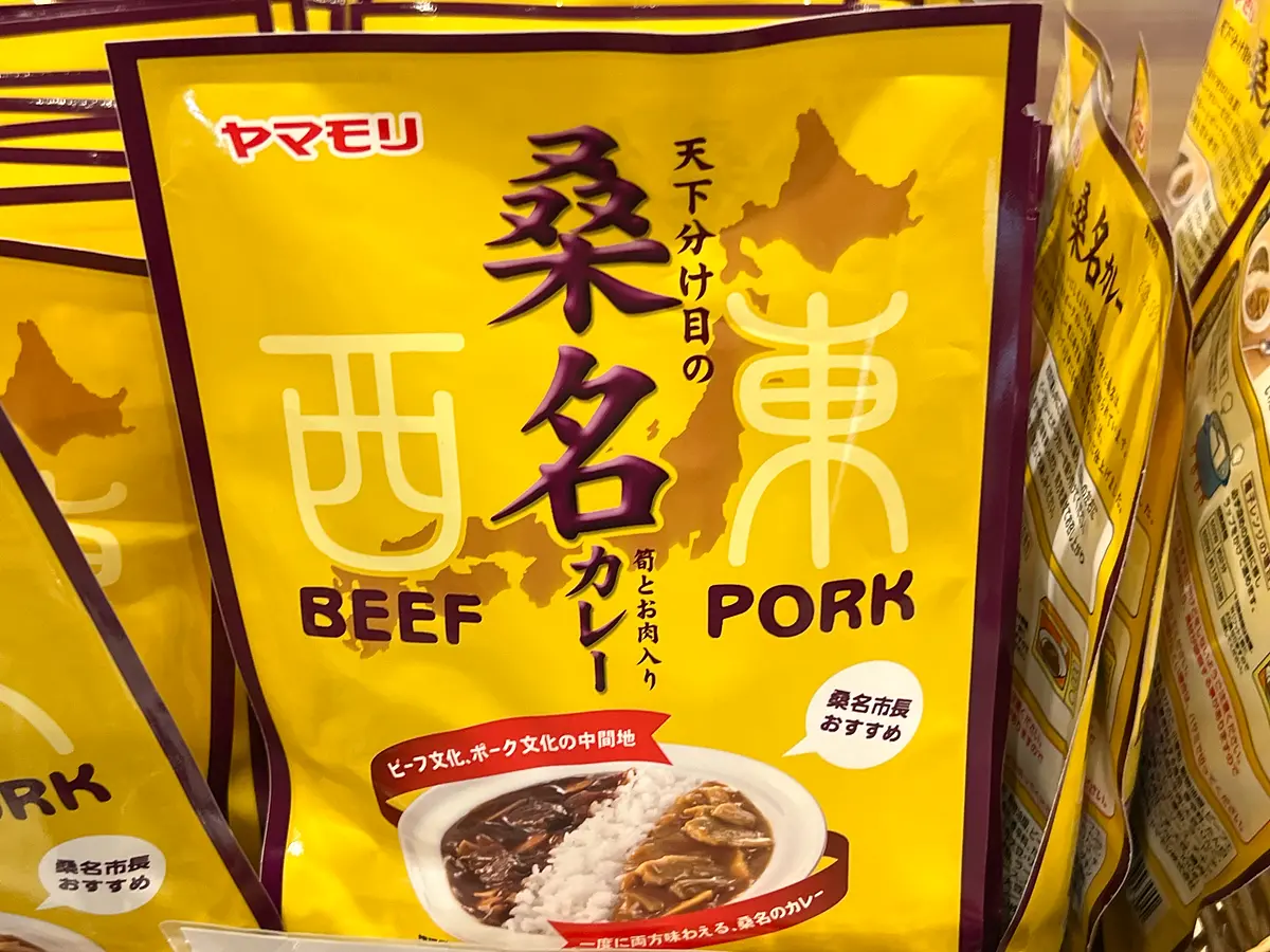 家庭のカレーに入れるのは牛肉?豚肉?桑名市長島町は牛肉派と豚肉派の境界線にあることから登場した、どちらも一度に楽しめる「天下分け目の桑名カレー」。お土産に喜ばれること間違いなしです。
