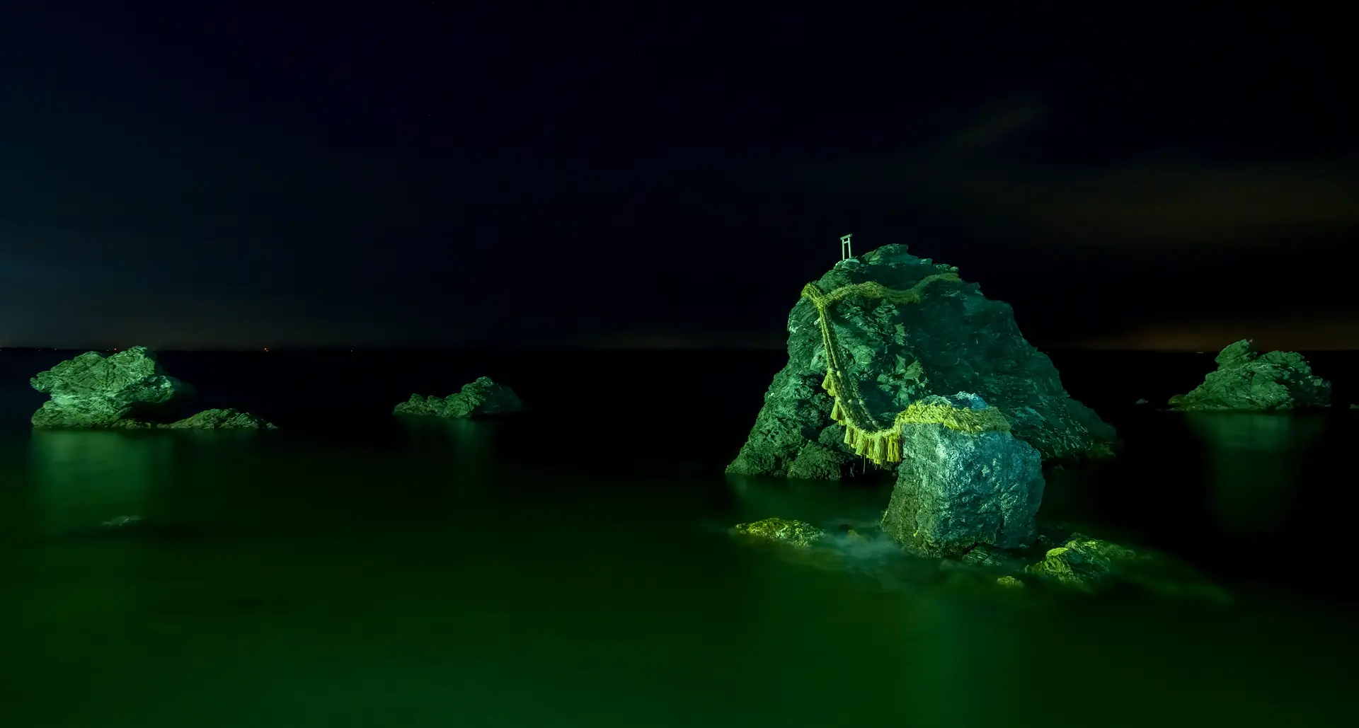 5月~7月は、夫婦岩の間から昇る朝日を見ることができます。11月~1月、冬の季節に見られるのは、夫婦岩の間から満月の昇る幻想的な景色。