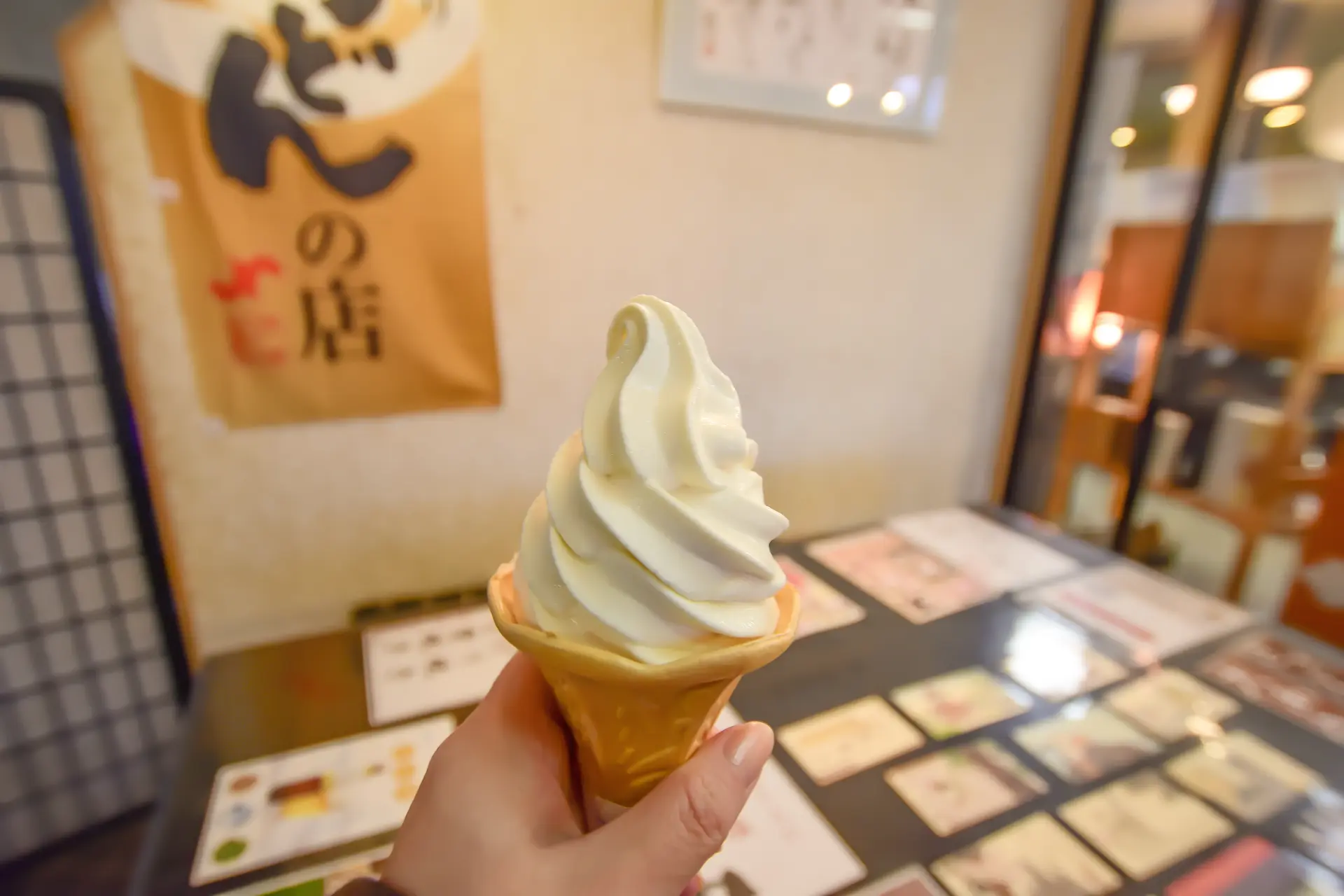 参拝の後に、ひとやすみ。「岩戸の塩」を使ったソフトクリームは神社から駐車場に向かう途中、徒歩でおよそ3分ほどのところにある「食事処まるはま」で味わえます。