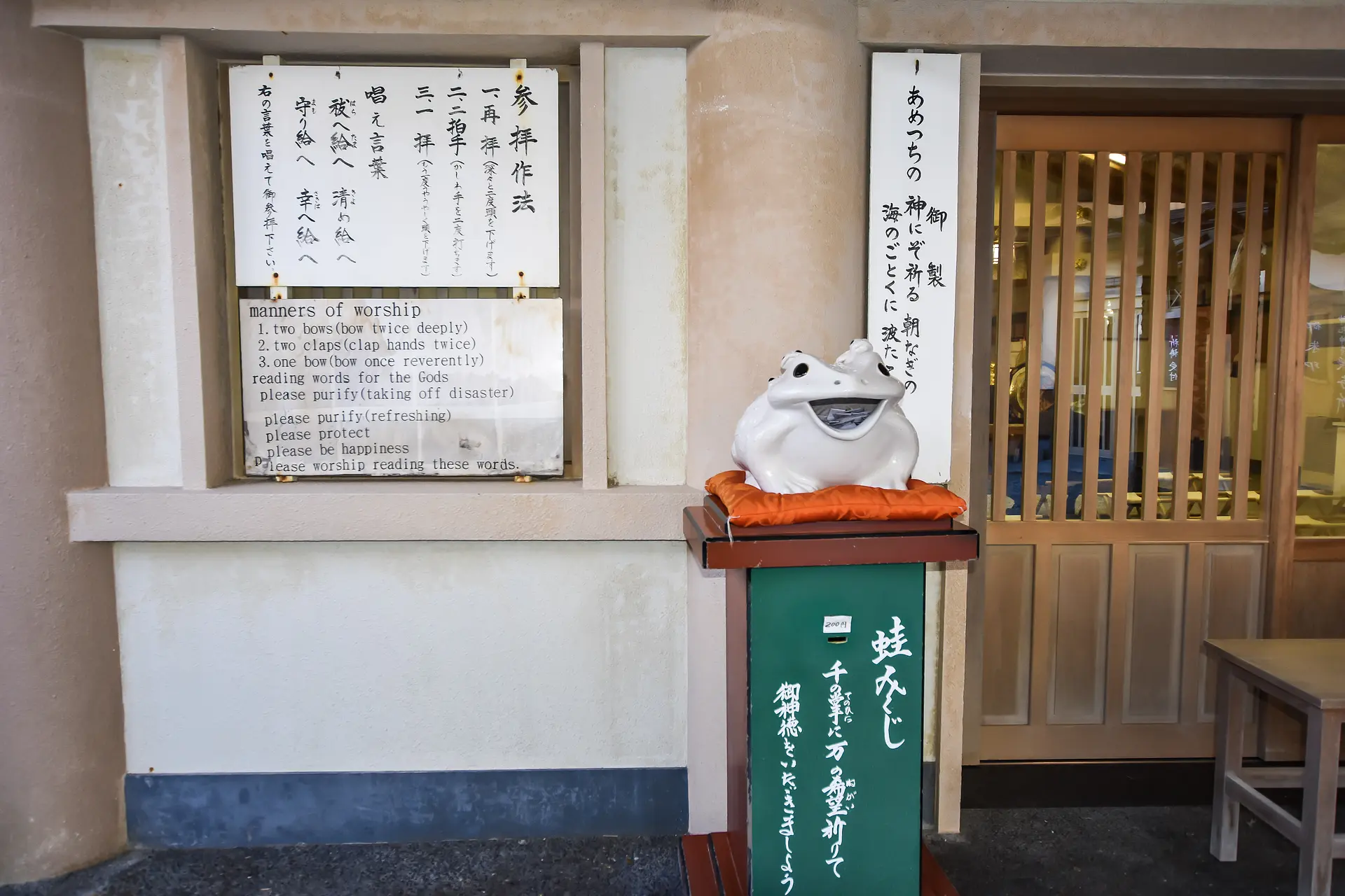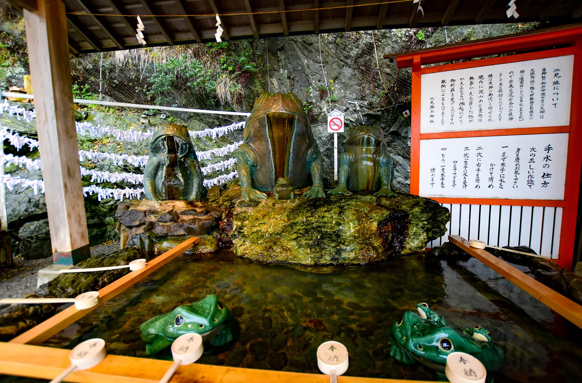 最初に迎えてくれるのが手水舎の「満願蛙」。水をかけると願いが叶うと言われています。