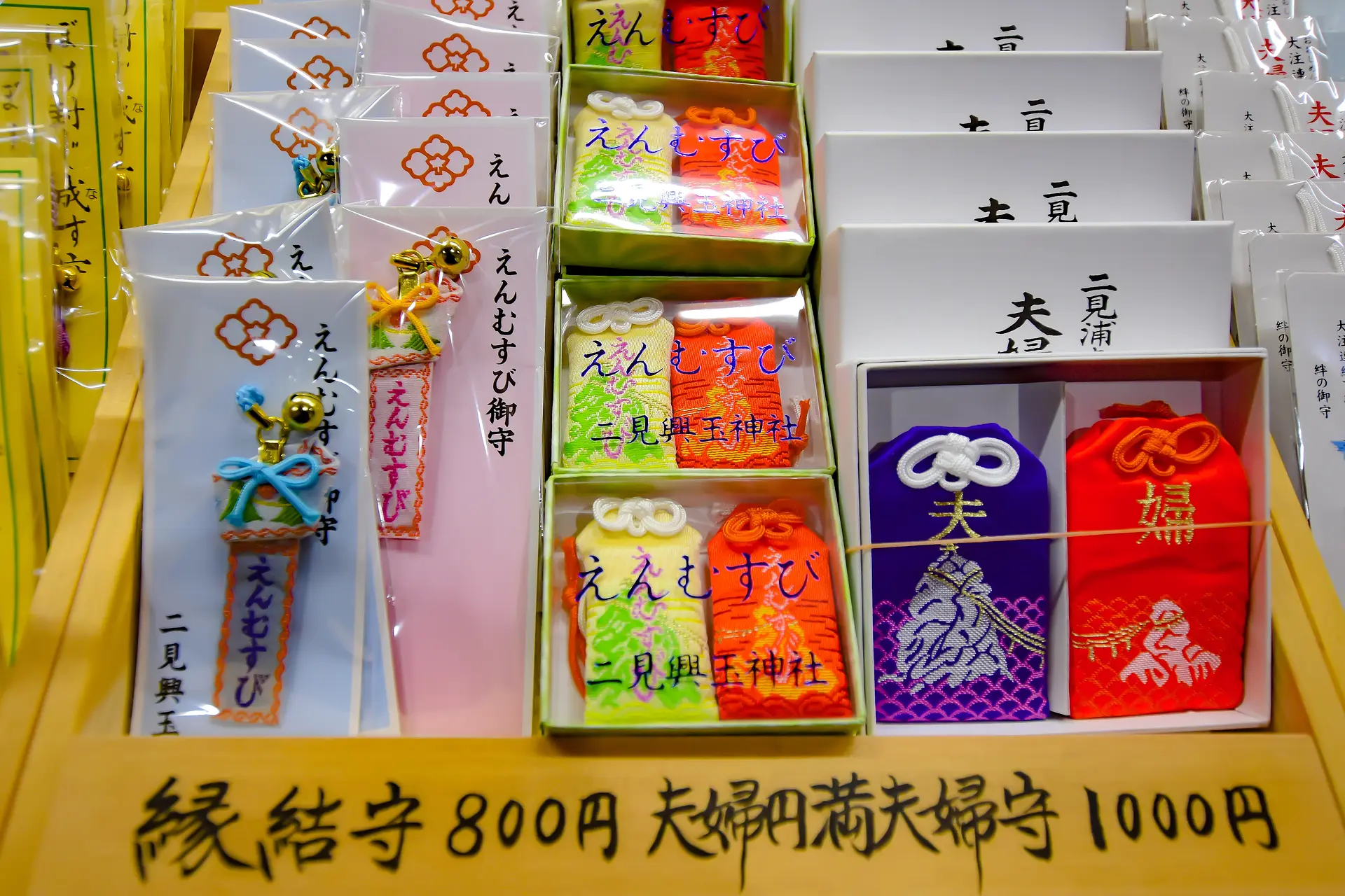 縁結びと夫婦円満のご利益で有名なだけあって、御守りがたくさん並んでいます。