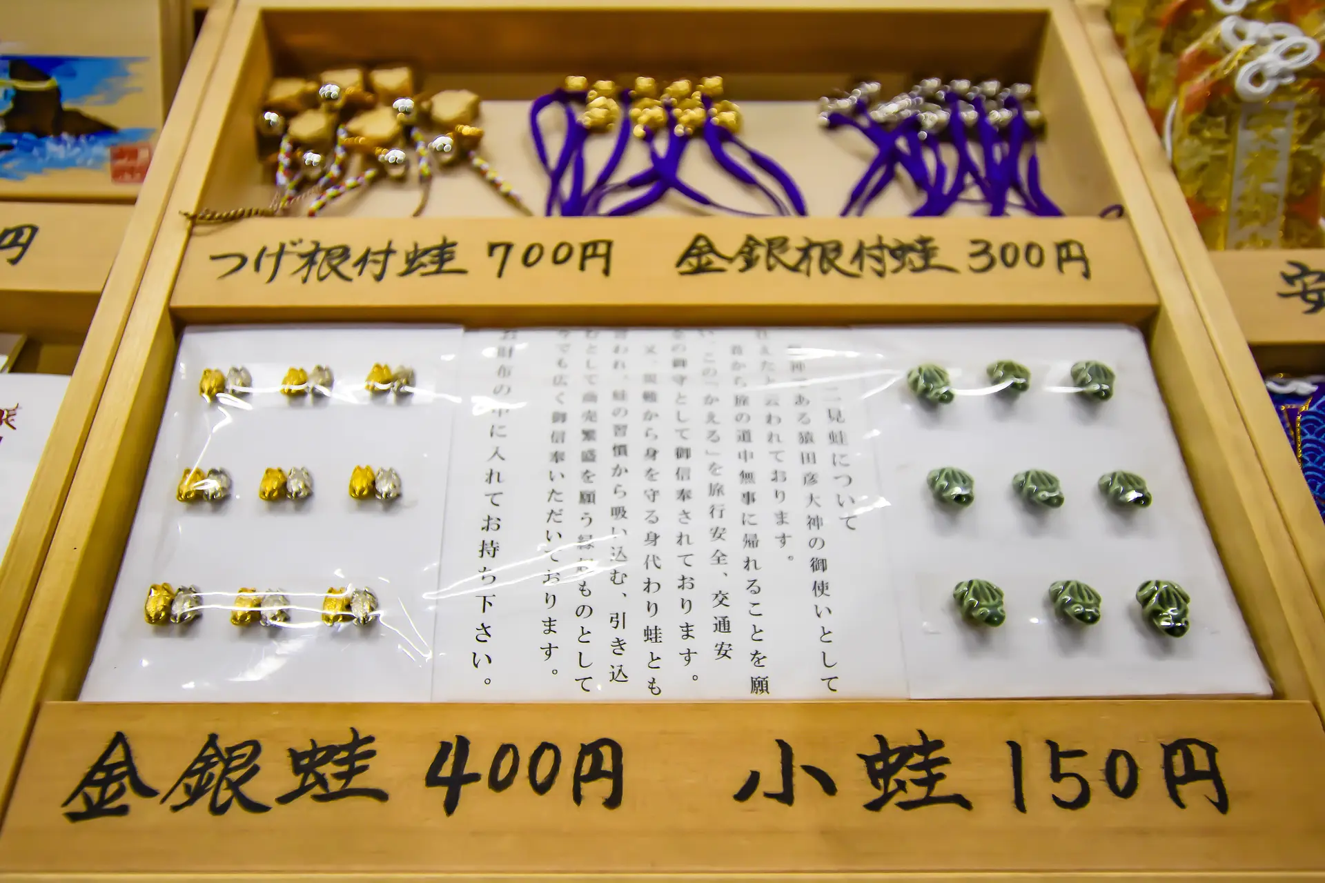 無事に「かえる」ための旅行安全、交通安全の御守です。商売繁盛の縁起物でもあるこの蛙たち、お土産にもよさそうですね。