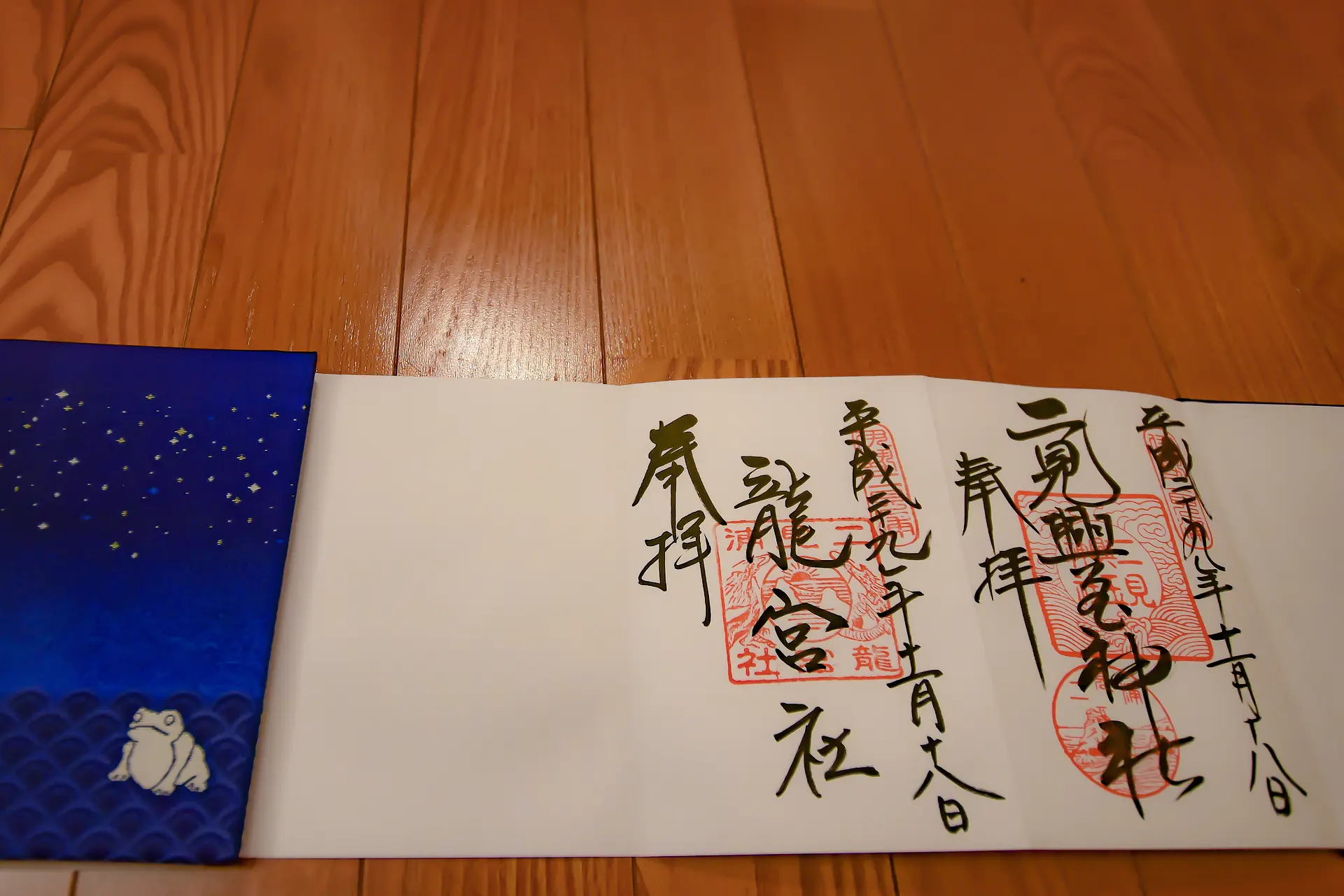 迷いに迷って選んだ満月の御朱印帳の背表紙側には、かわいい蛙の刺繍が施されていました。
