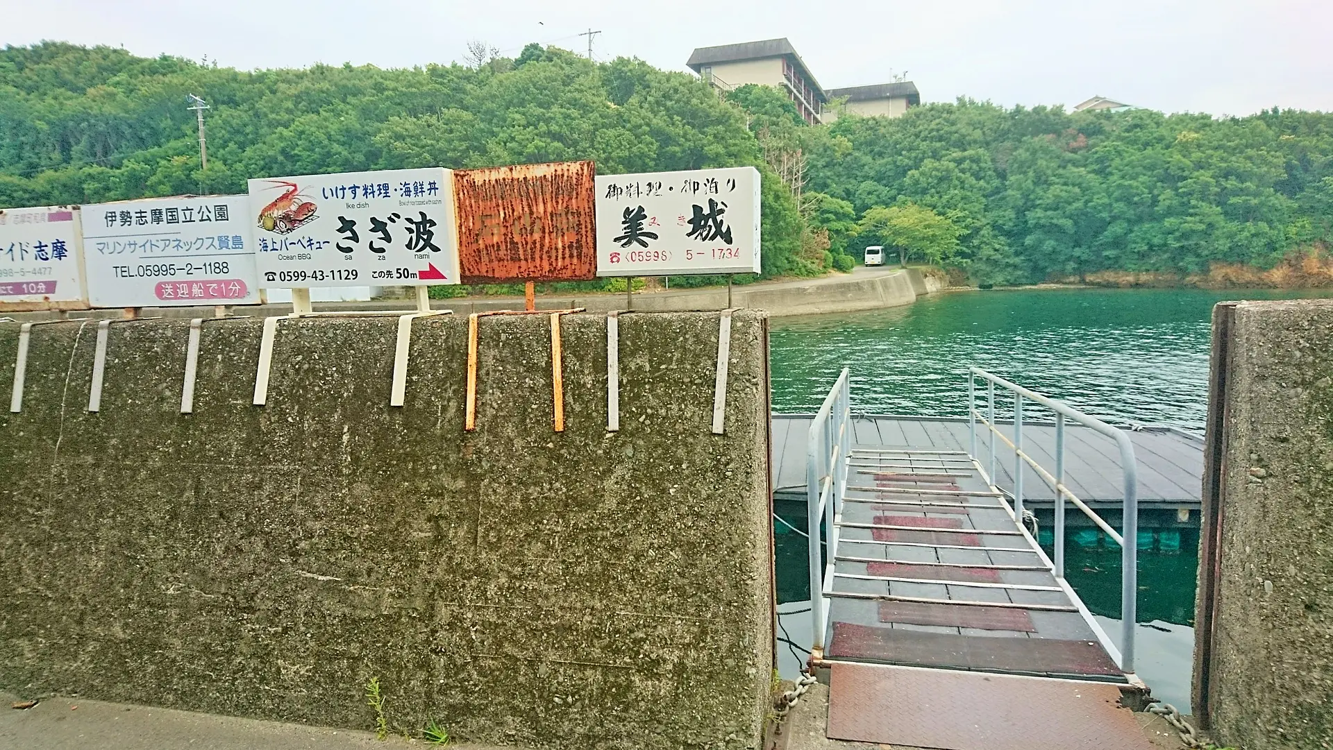 志摩地中海村の船着き場は、レンガ造りのレストランRIAS(リアス)を右わきに抜け、階段を下に降りたところにあります。