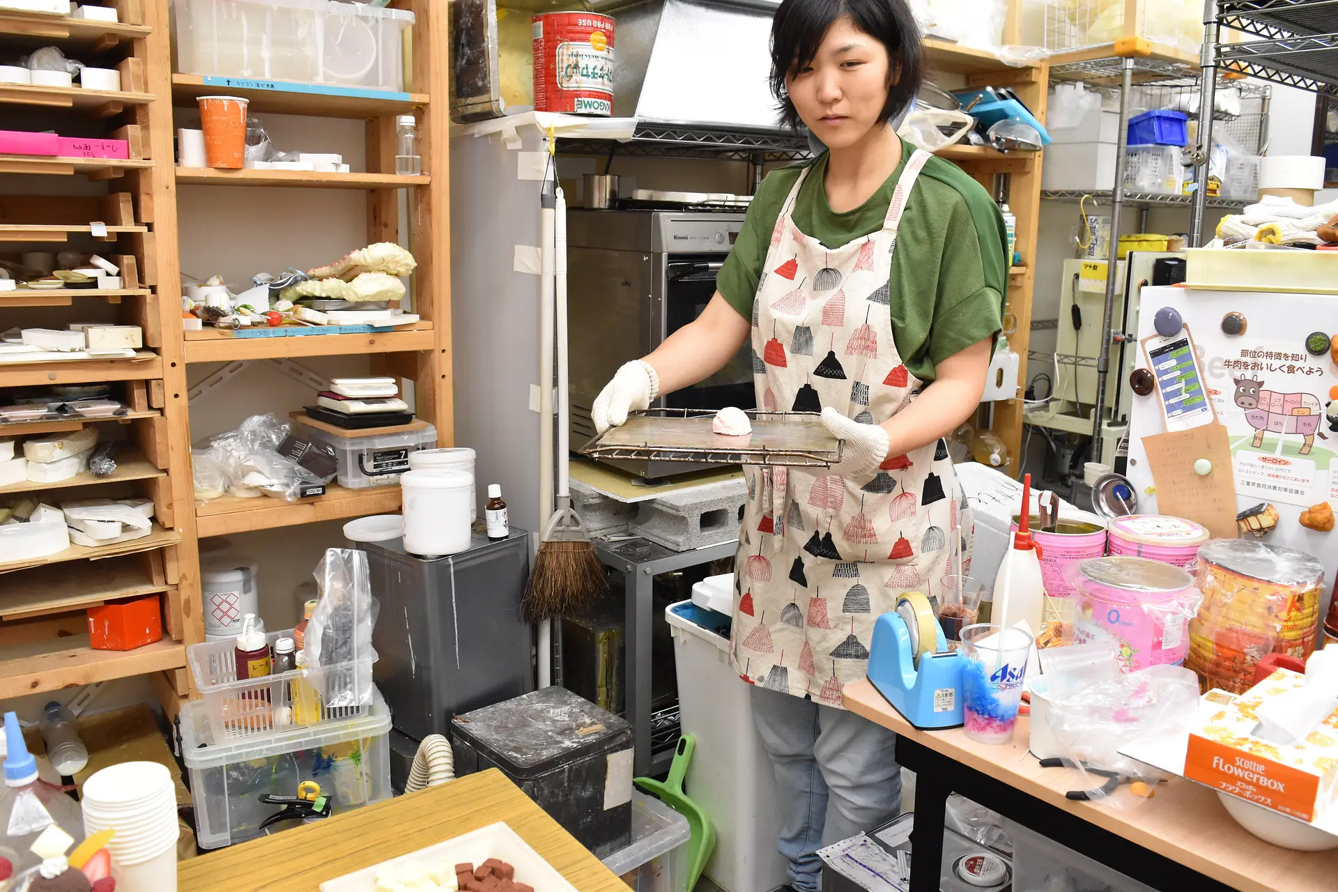 「では、このアイスを固めますね。今はまだバラバラなので」と安藤さんはアイスをオーブンの中へ入れました。