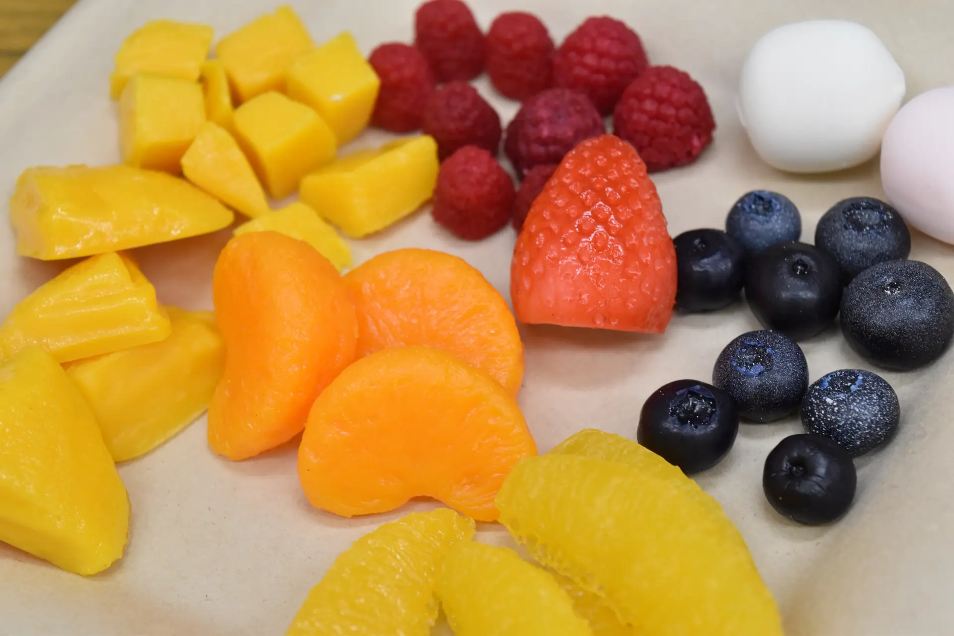 ラズベリー、ブルーベリー、イチゴ、マンゴー、黄桃など、どれも美味しそう!それもそのはず、どれも本物のフルーツから型を取っているそう。