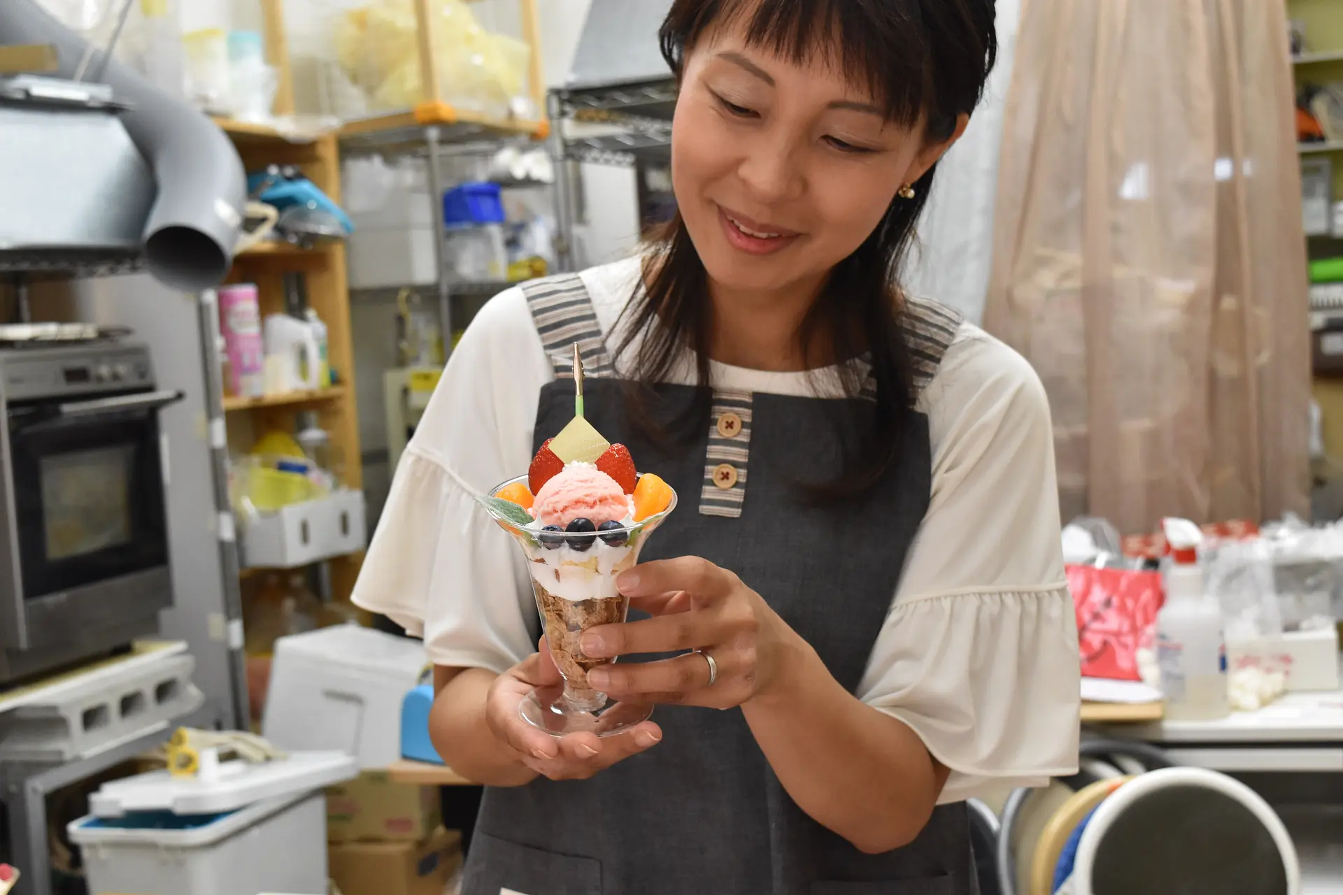 今回は夏気分で、パフェづくりに挑戦します。ちなみに店内は食品サンプルの展示だけでなく、まるで実験室のような製造スペースも惜しみなく公開されています。