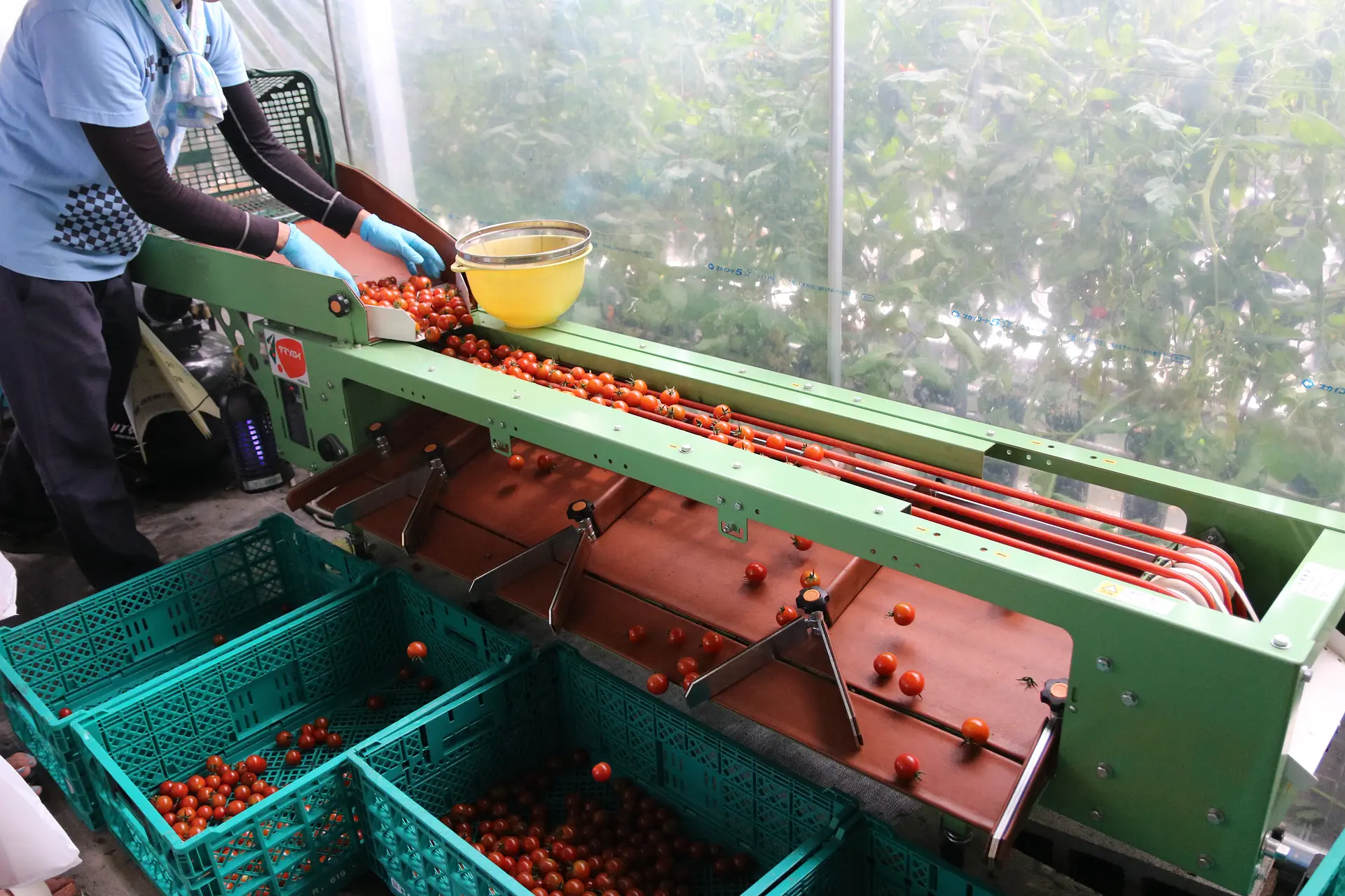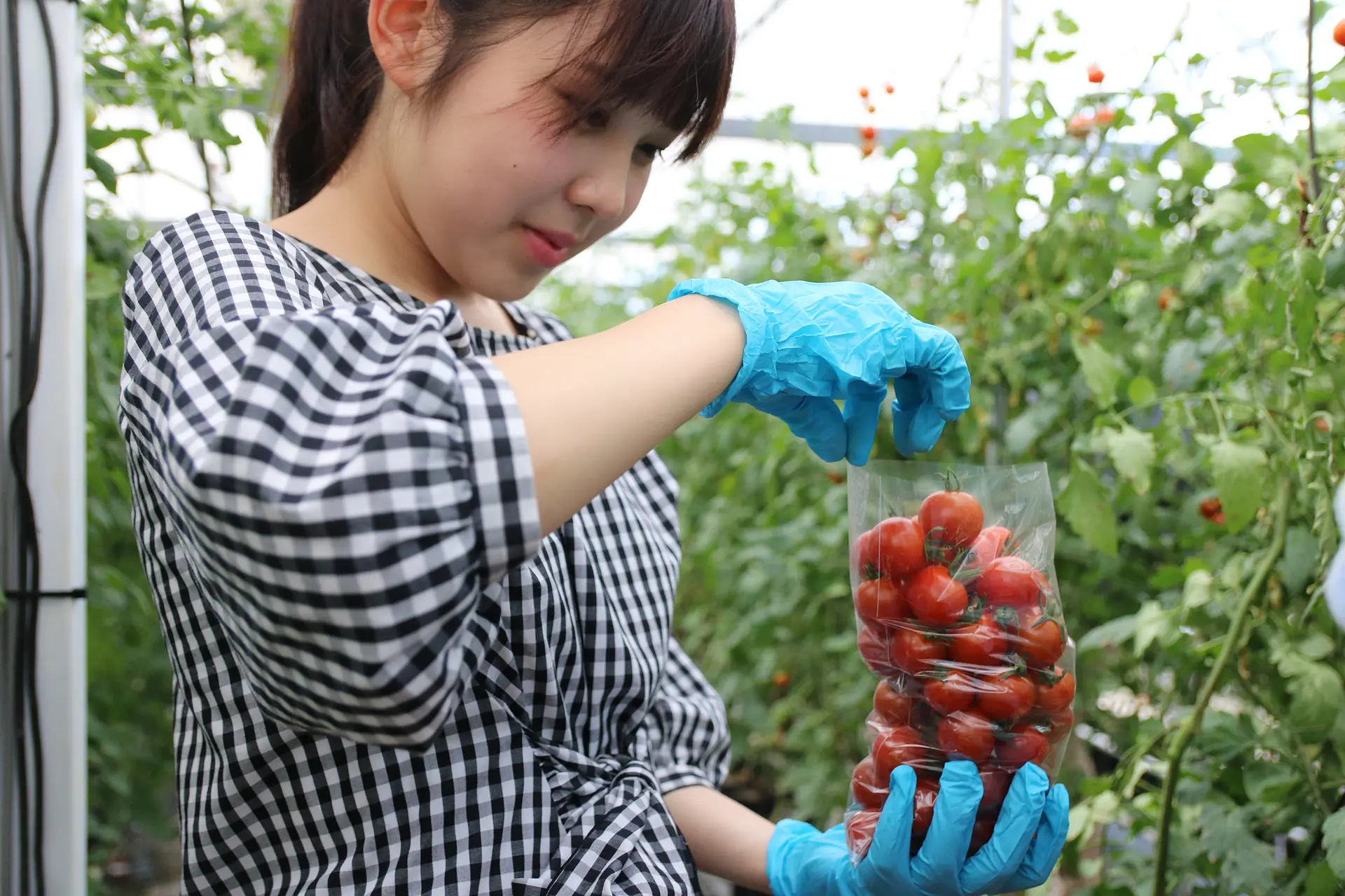一人一人に適正な業務分担を徹底することで、1年中栽培する野菜の品質を保っています。詰め放題体験ができるミニトマト「千果(ちか)」も、甘く光沢があって美しい!