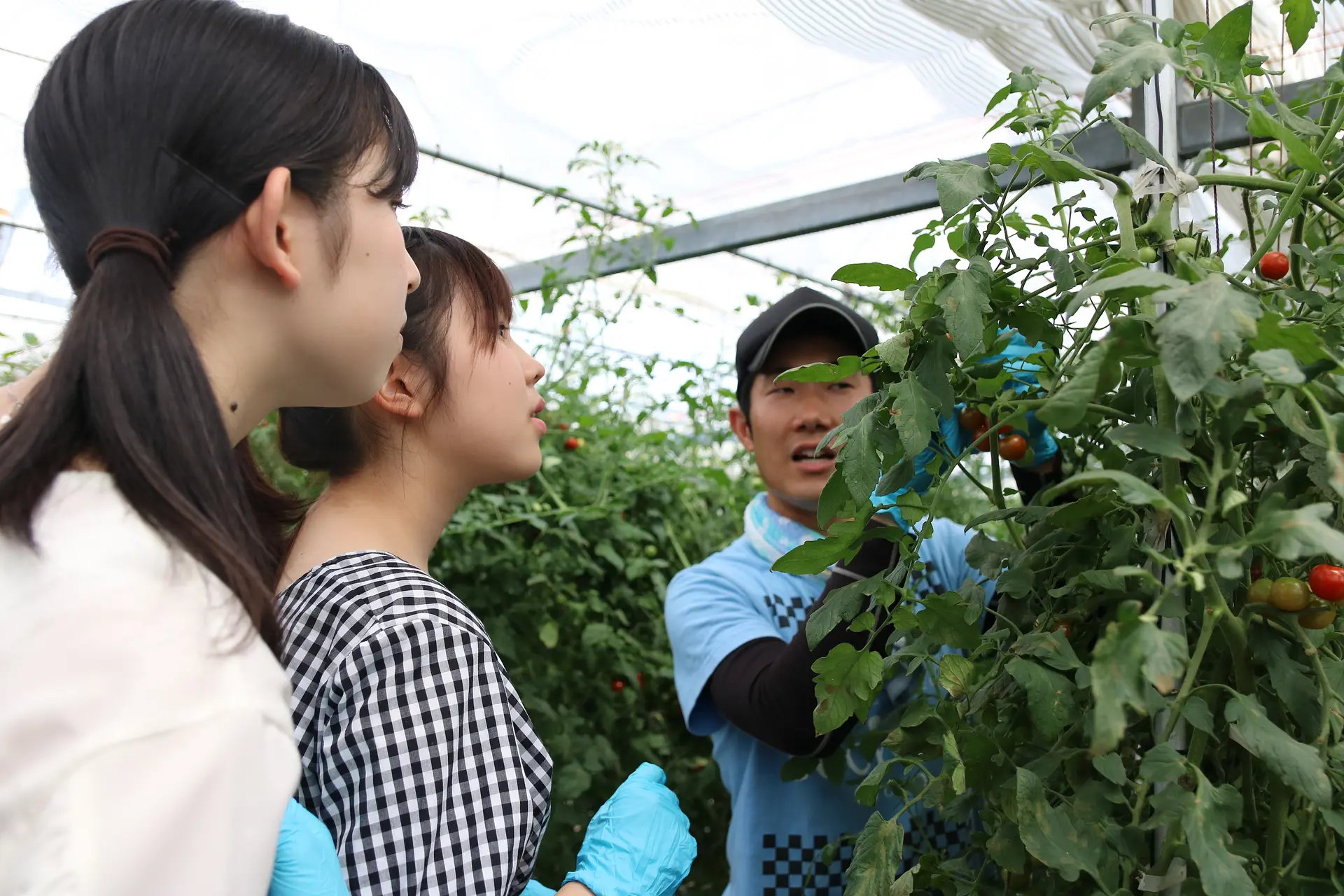 ハウスいっぱいに実るトマトにワクワク。農業の知識が豊富な谷口さんに、注意事項や取りかたのコツをレクチャーしてもらいます。