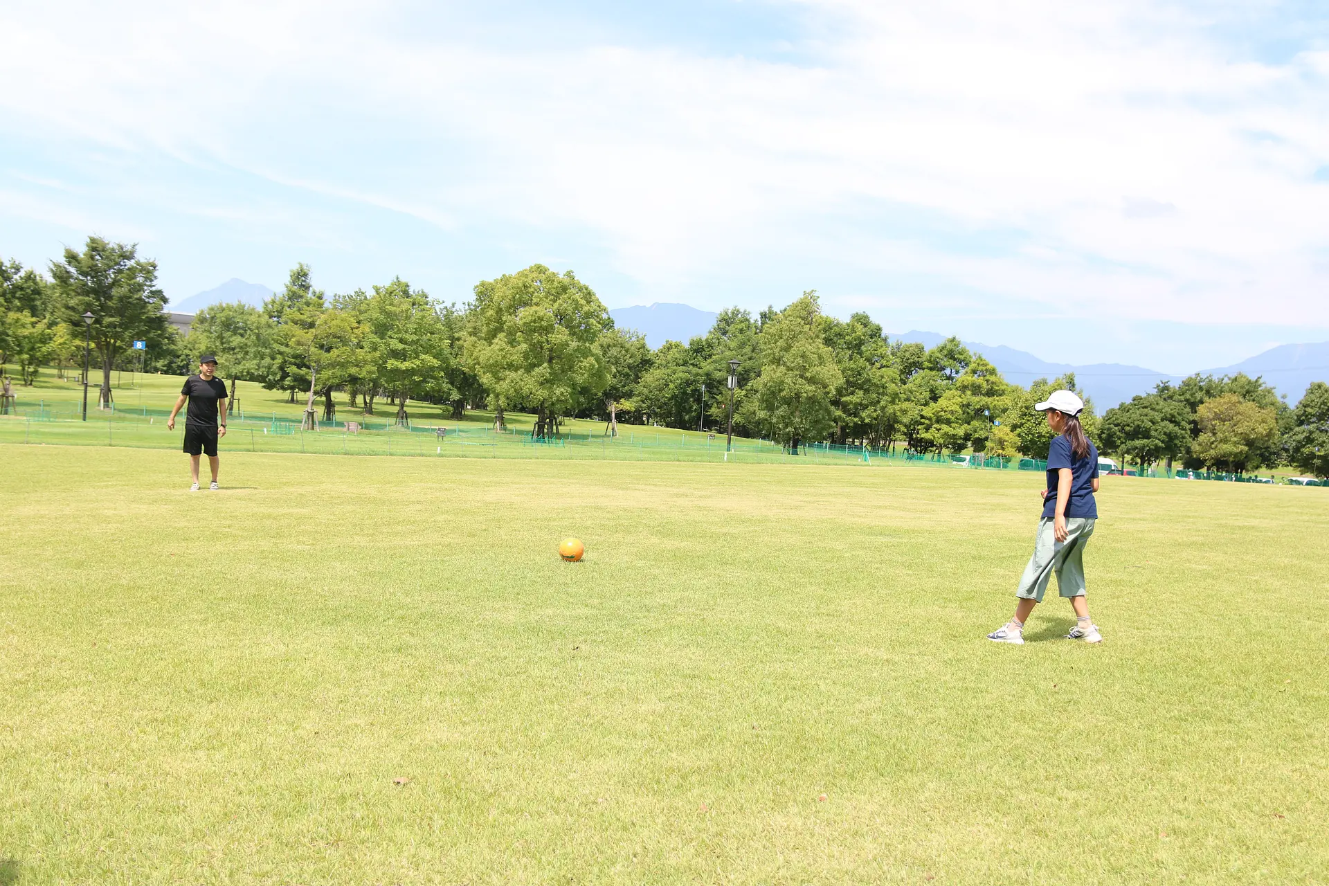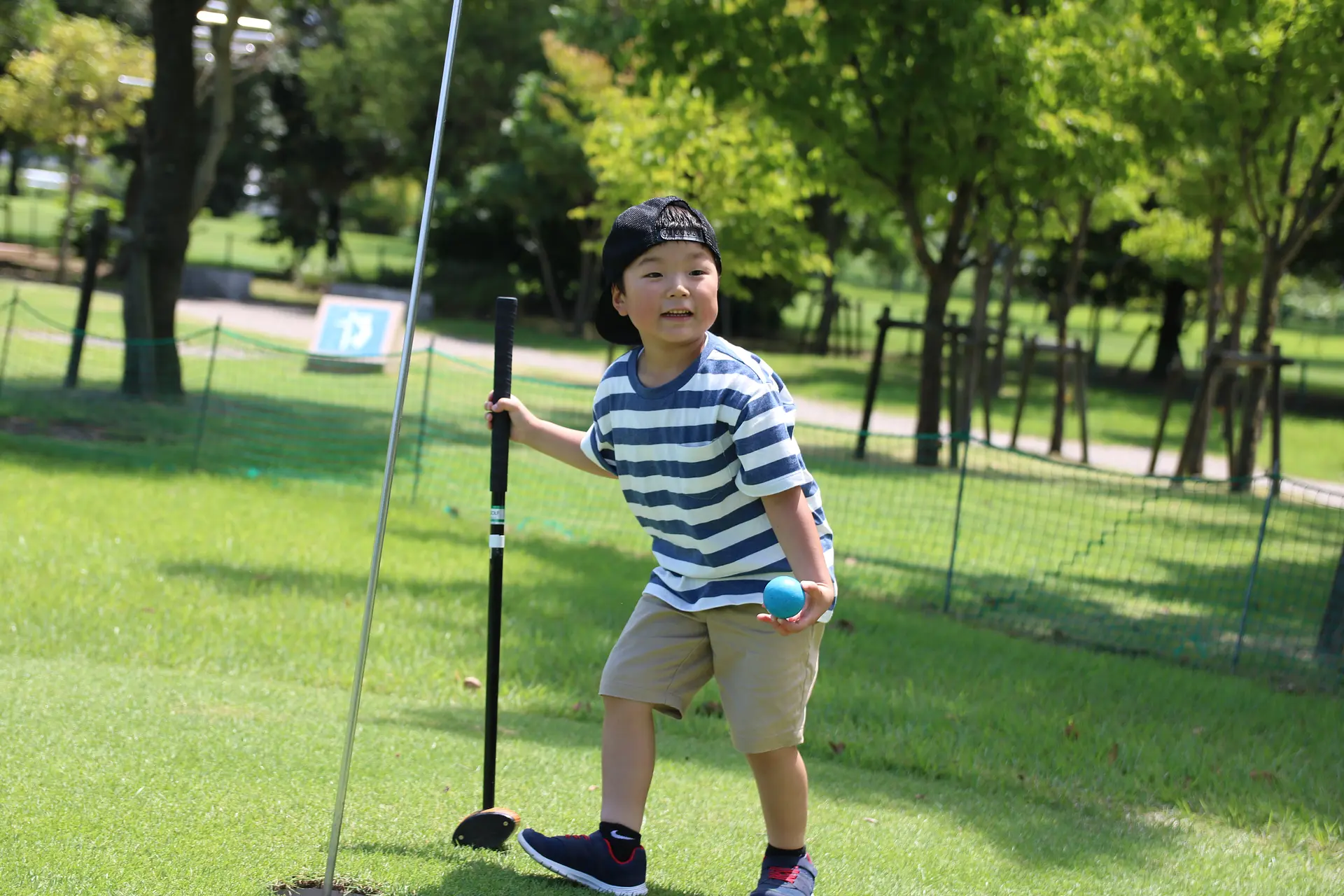 芝生広場内のパークゴルフコーナーではクラブとボールを1人100円で貸出ししているので、気軽にゴルフにチャレンジできます。普段あまりゴルフをしたことがない子でも、パワフルにボールをショット!