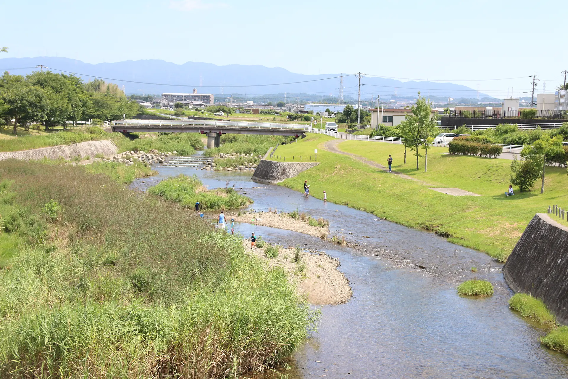 遊び広場へ繋がる大きな連絡橋からは浅瀬の戸上川があり、夏場は水遊びをする子供たちで賑わいます。