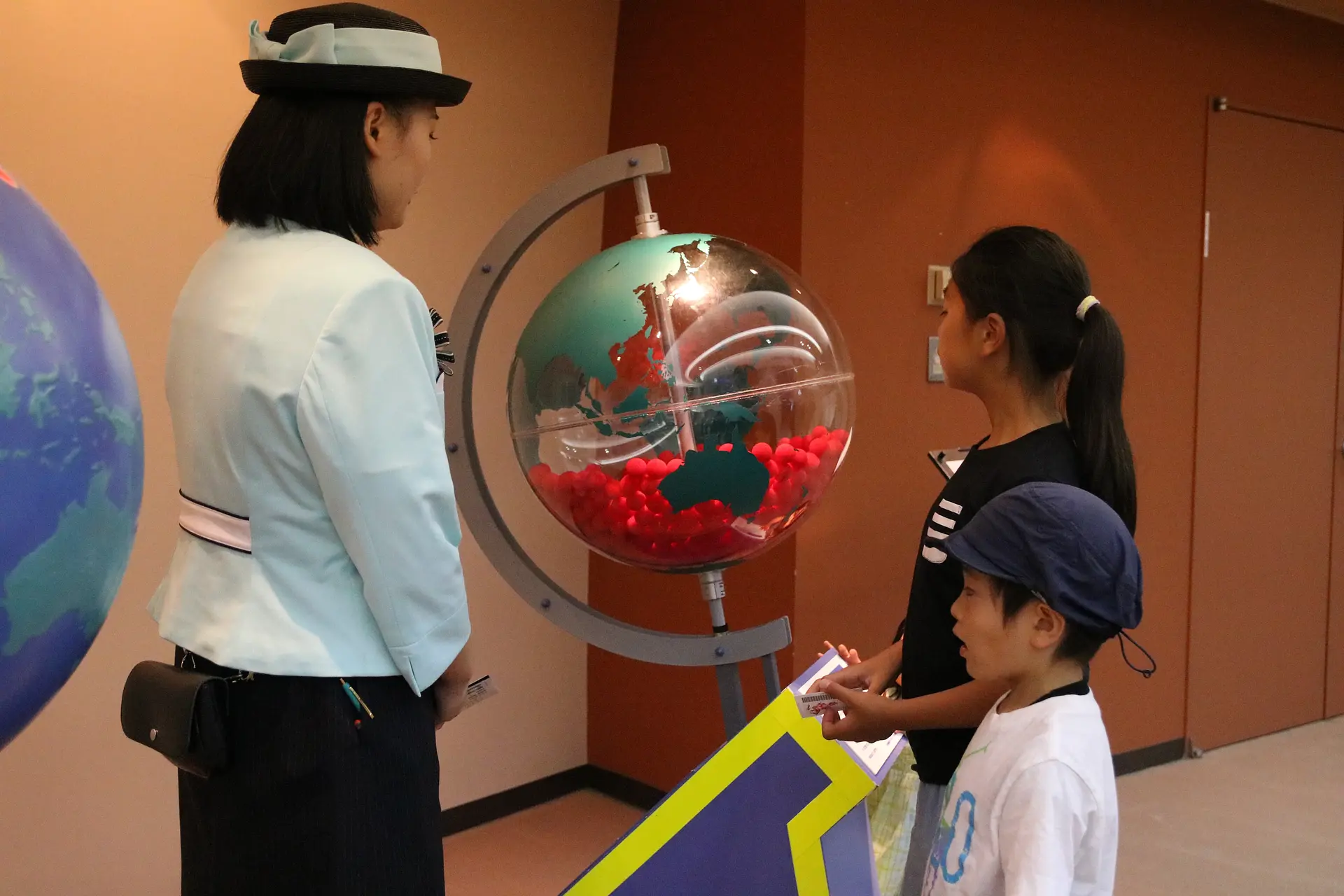 クイズ形式のディスプレイや、様々な種類の地球儀で人口やエネルギー消費量などをわかりやすく説明していて、子供たちは興味津々!