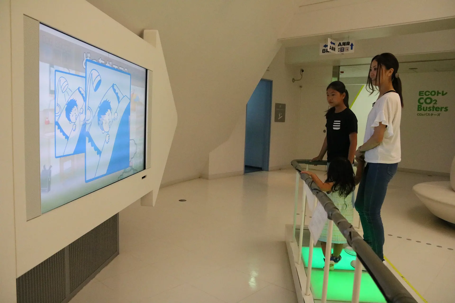 5階は、パネルを見ながら左右に動いてクイズに答えるゲームや、モニターに移された画面で、上から落ちてくる温暖化に影響を与えるものをタッチして消していく体感型ゲームなど、たっぷりと体を動かせる人気のフロア。“ECOトレーニング”をキーワードに環境やエネルギーのことを楽しく知ることができます。