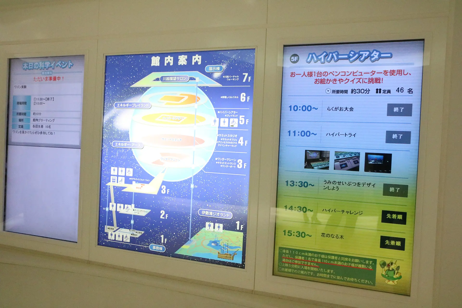 子供たちに大人気の「ハイパーシアター」は、タッチパネルを使ってお絵かきや塗り絵・電気や環境を学ぶクイズに参加できます。