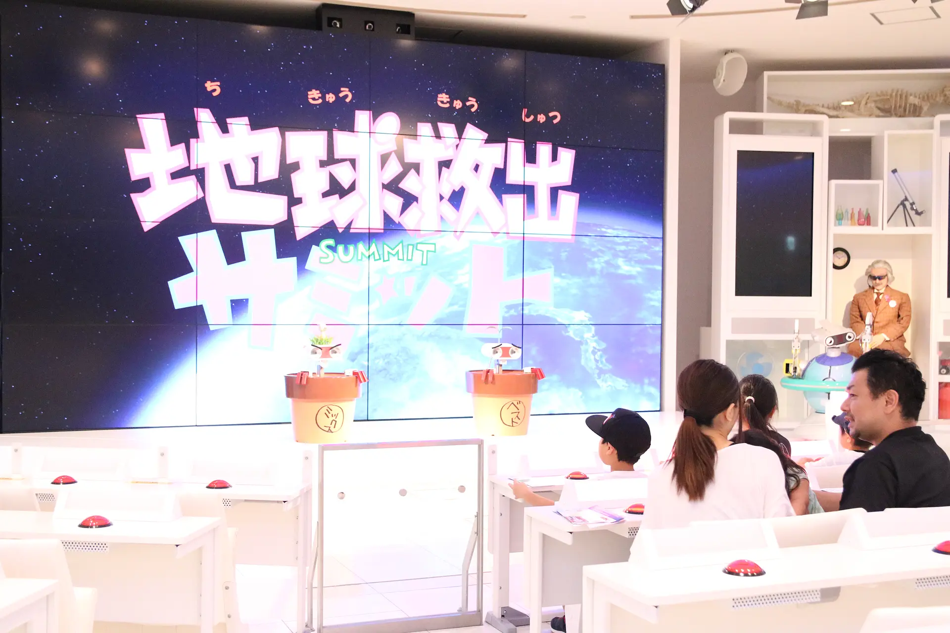 中央にあるサミットスタジオでは「地球救出サミット」と題して、ロボットの「ミックスくん」と「ベストくん」が司会者になって個性豊かな首脳たちと一緒に、地球をいろいろな危機から救出する方法等を考えます。家族みんなで相談しながら、地球の救出方法に「賛成!」と思ったら手元のボタンを押しましょう!