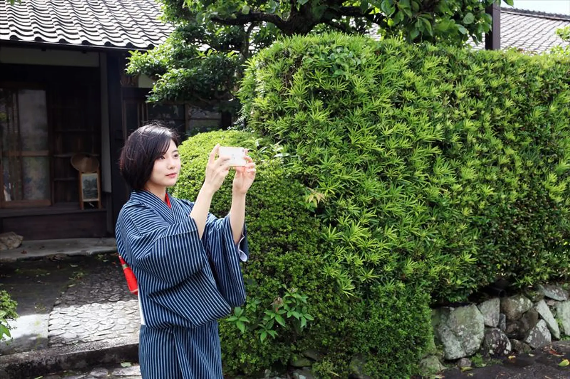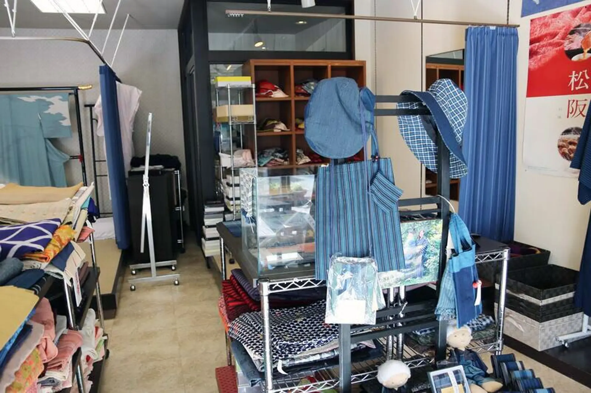 ここでは藍染の色と縞模様が特徴である、松阪木綿で作られた着物の着付けを行なっています。