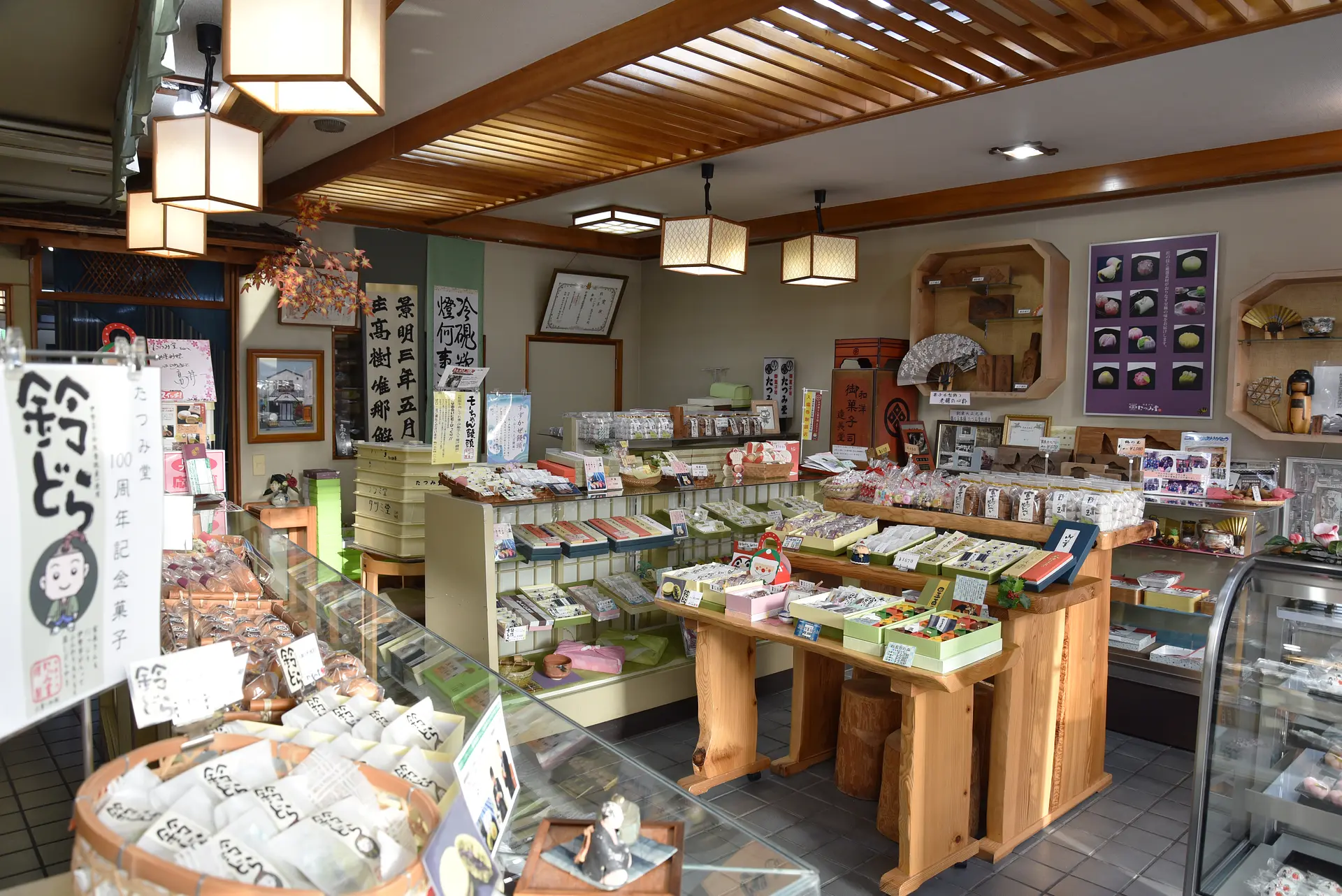 1つ1つ手作りにこだわっているたつみ堂には、地元の特産物をモチーフにした和菓子など、数多くのお菓子がお店に並んでいます。