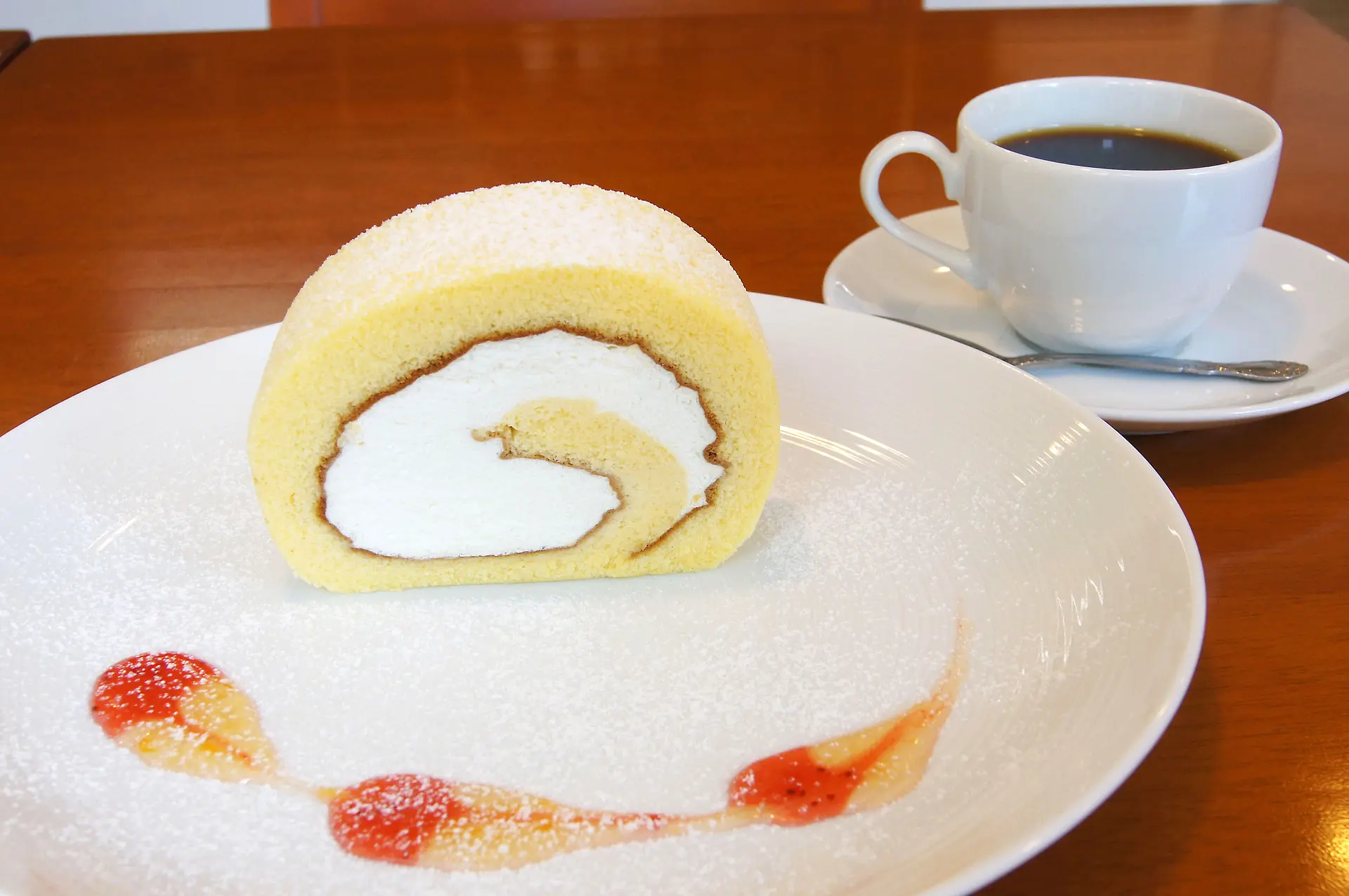 人気メニューの「プレーンロールケーキ」(1カット270円。+250円でドリンク〈コーヒー・紅茶など〉とセットにすることができます)。