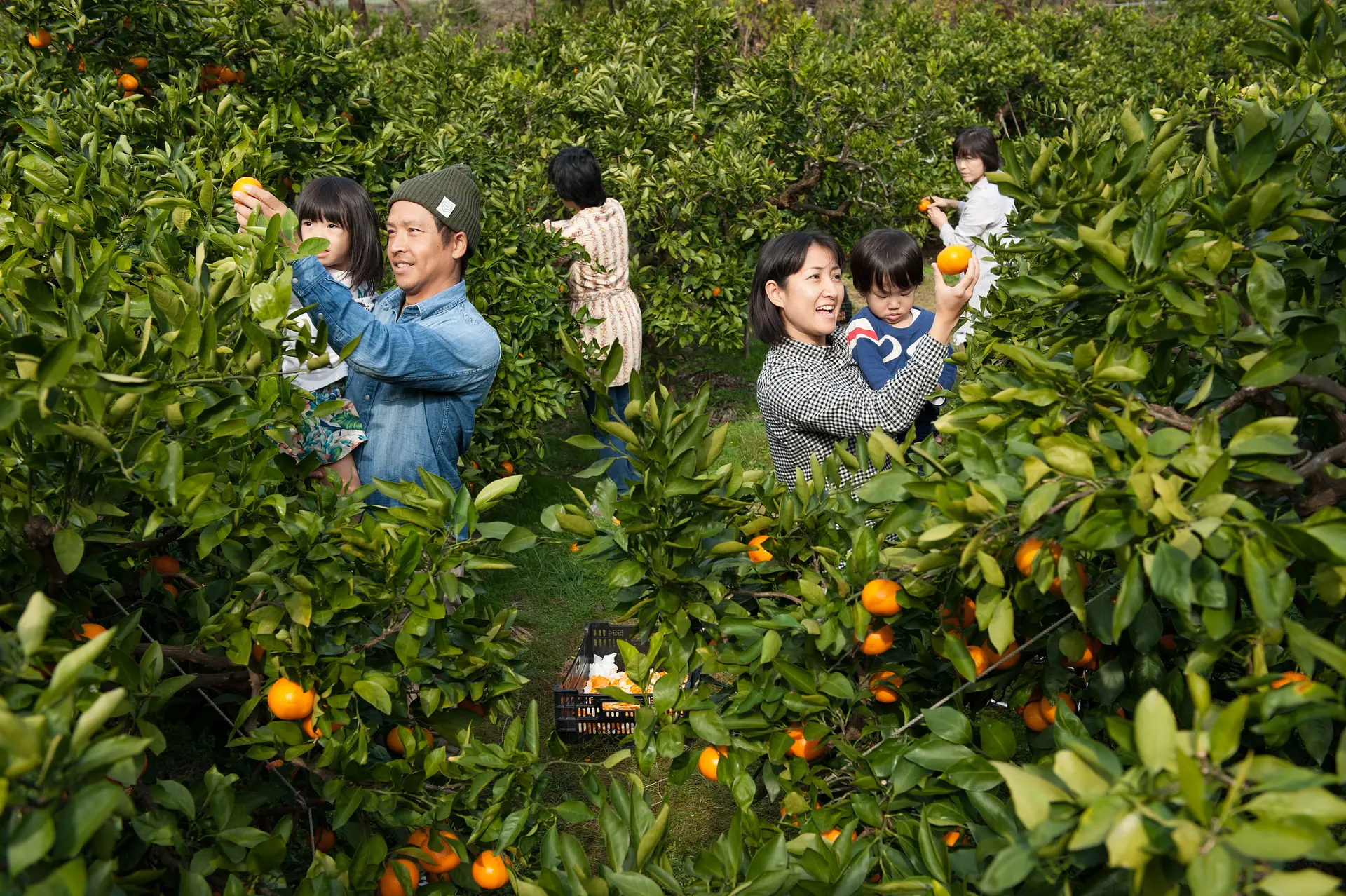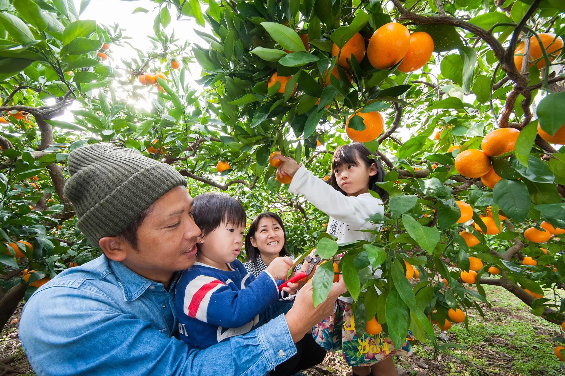 葉が生い茂った果樹園での「みかん狩り」は、探検気分も味わえて楽しい!