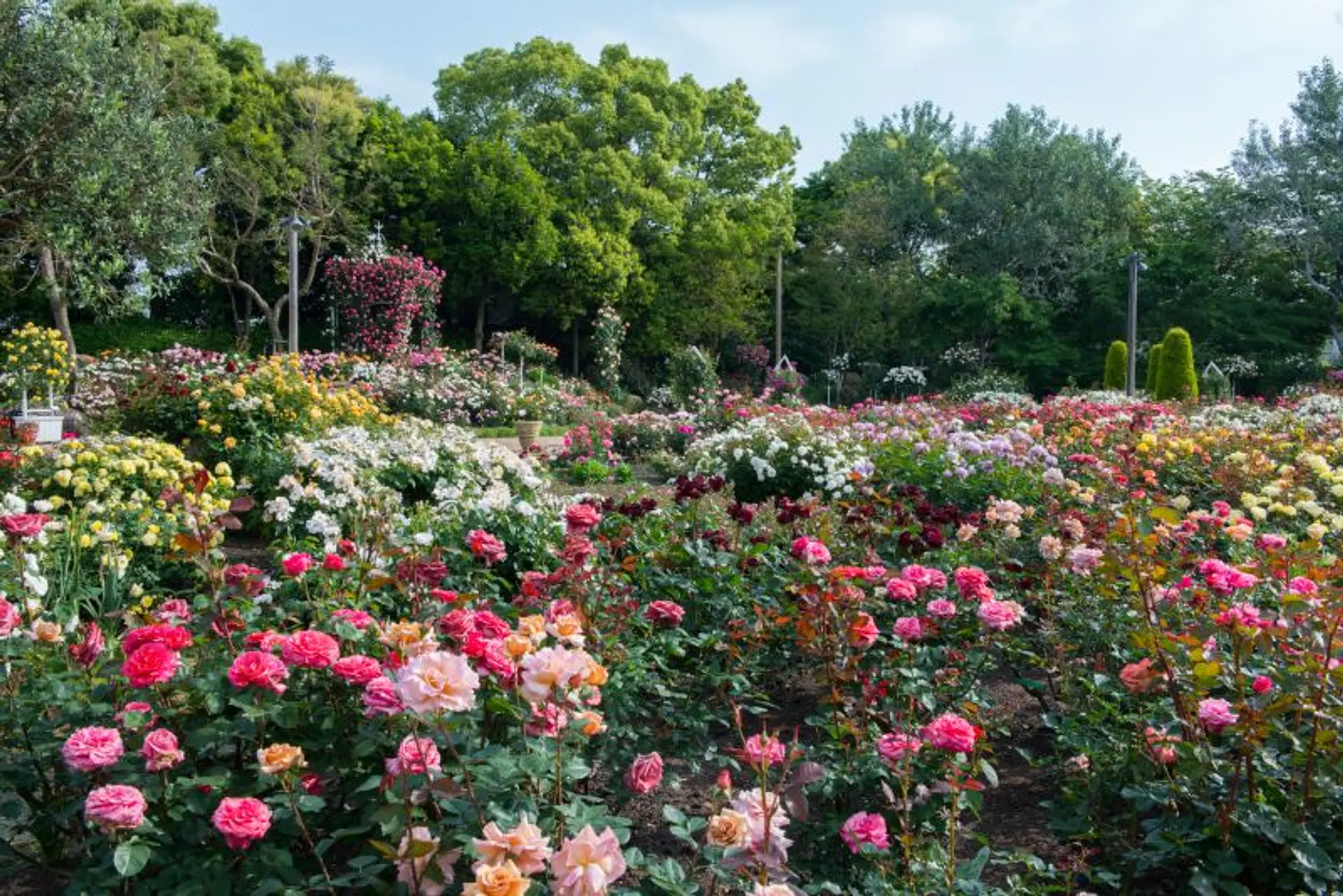 バラ園は華やかな香りと彩り豊かな光景に魅了されるエリアで、春バラと秋バラの品種が植栽されています。