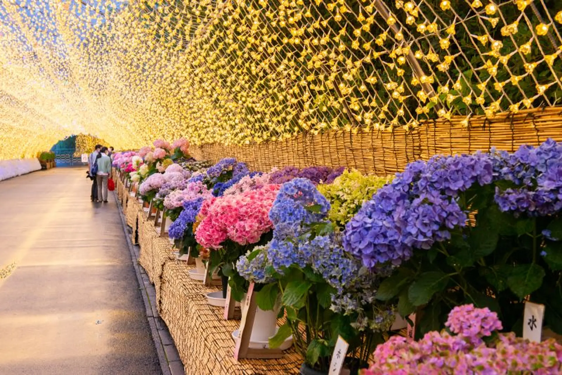 全長200mのトンネル内に約300鉢の紫陽花と花しょうぶが展示され、夜はライトアップされた光景と共に鑑賞できます。