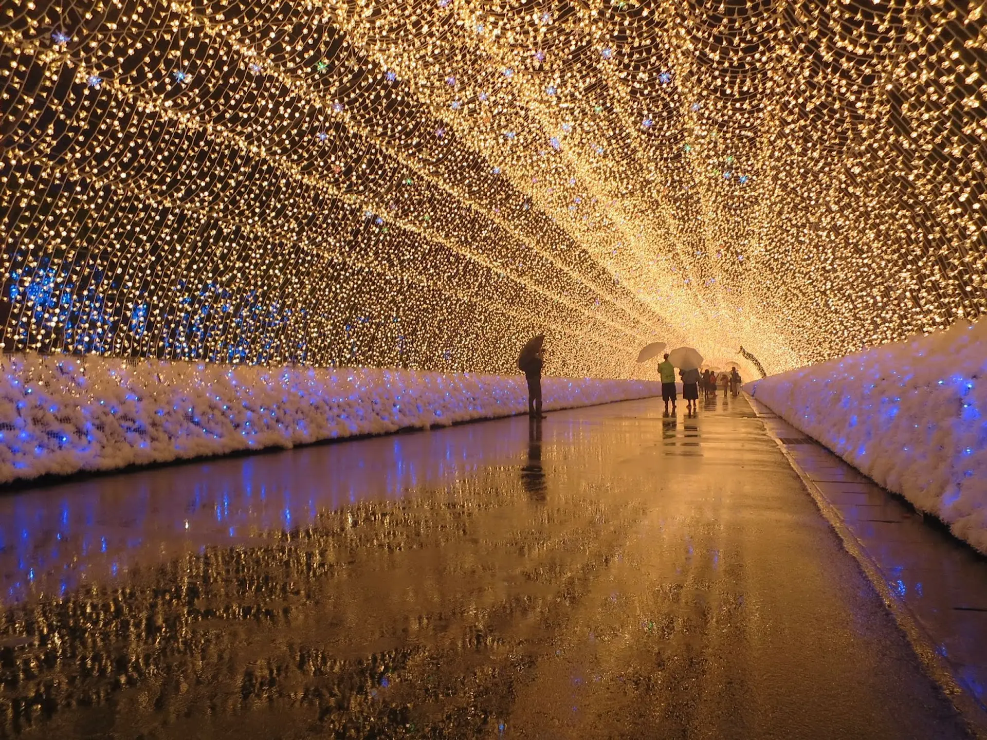 トンネルの中は圧倒的な煌めきに包まれる空間で、雨の日は水たまりに映るイルミネーションがとっても幻想的!