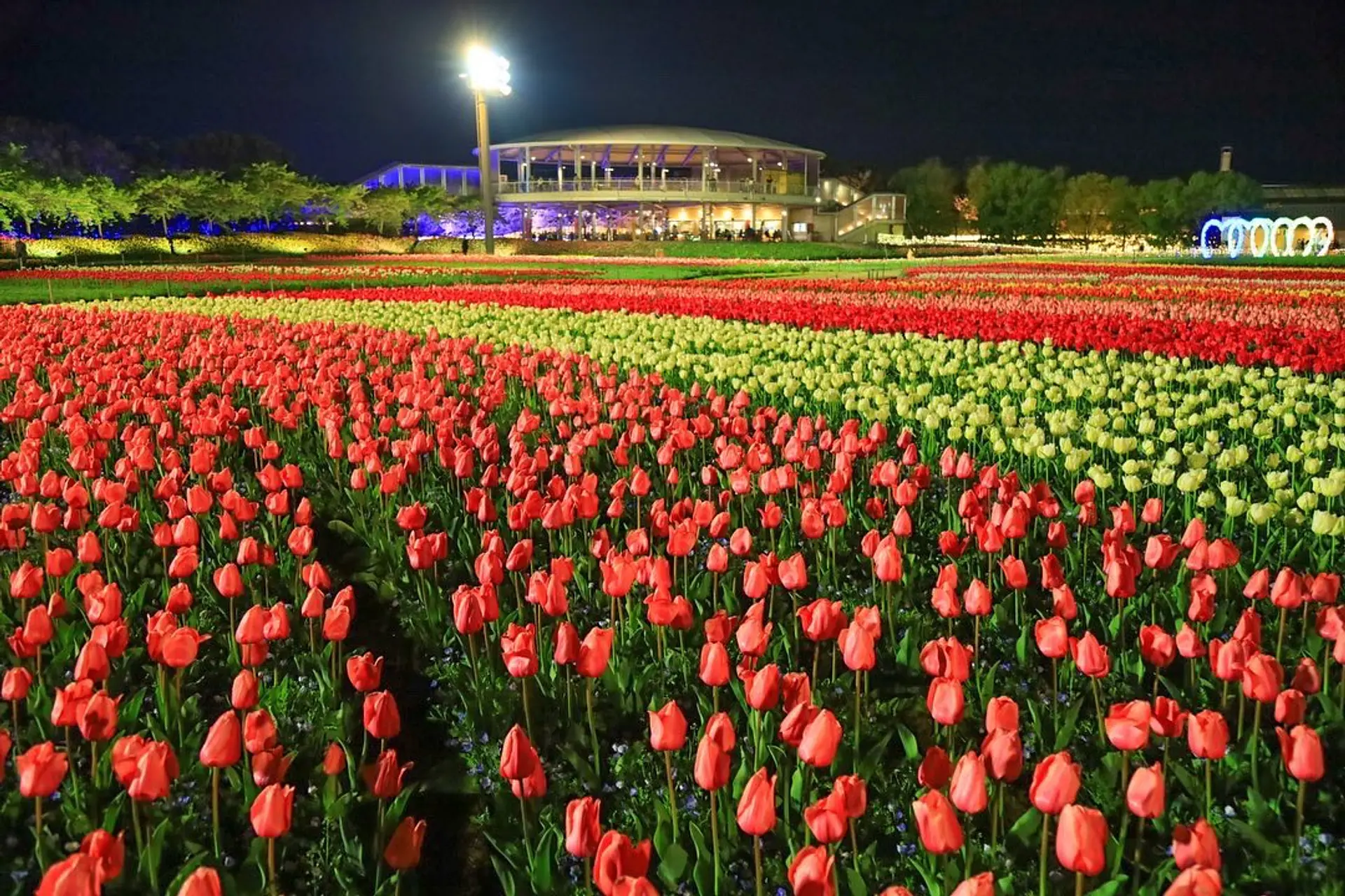 夜は幻想的なライトアップも実施され、昼と夜で表情の違うチューリップを堪能できます。
