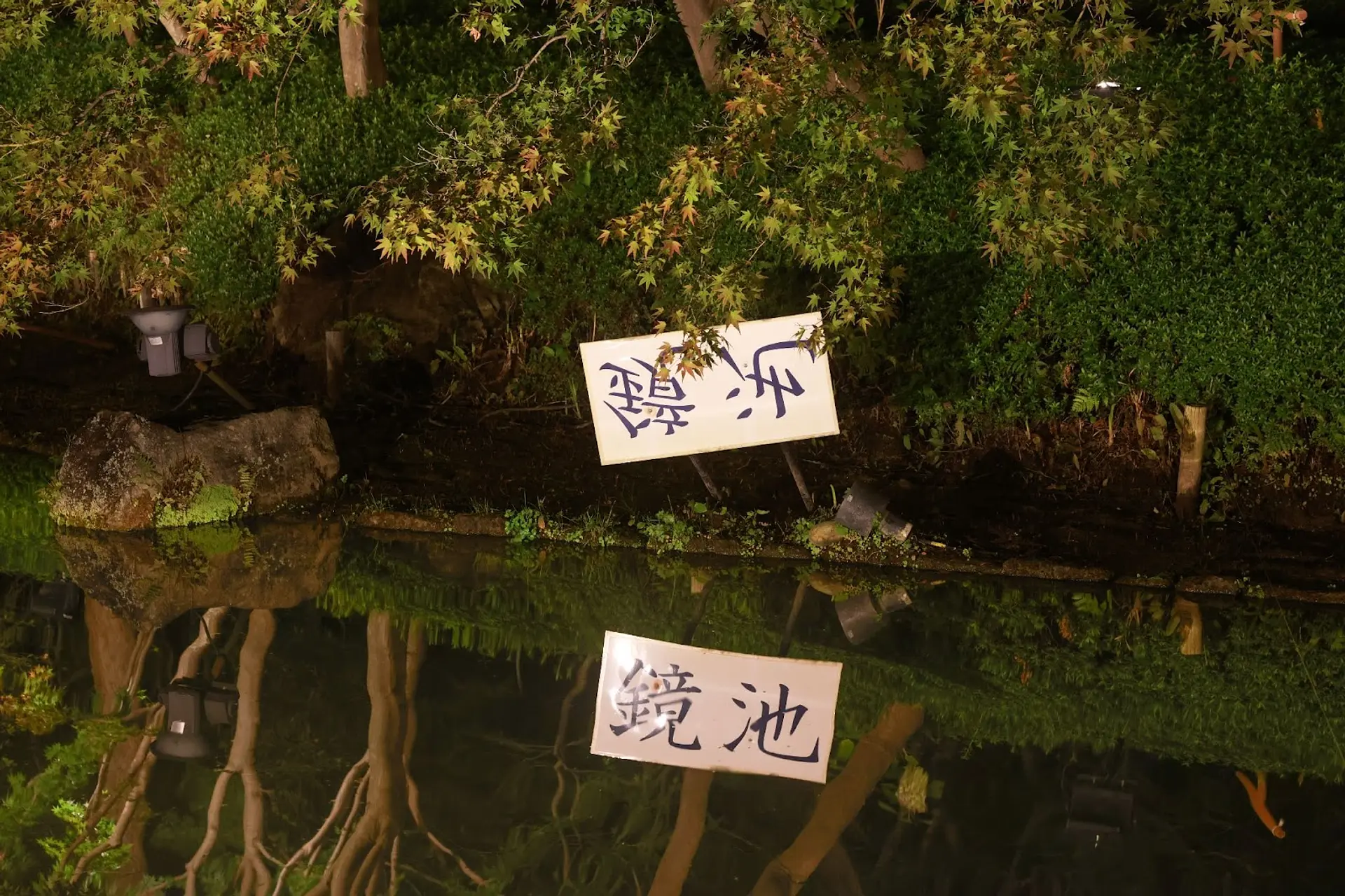 「鏡池」と記された看板が水面に映る鏡文字も見所で、風の弱い日が鑑賞できるチャンス!