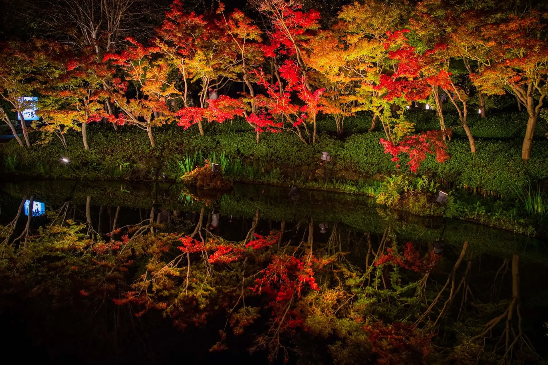 夜はライトアップされ、「鏡池」エリアでは水面に映る幻想的な紅葉を鑑賞できることも。