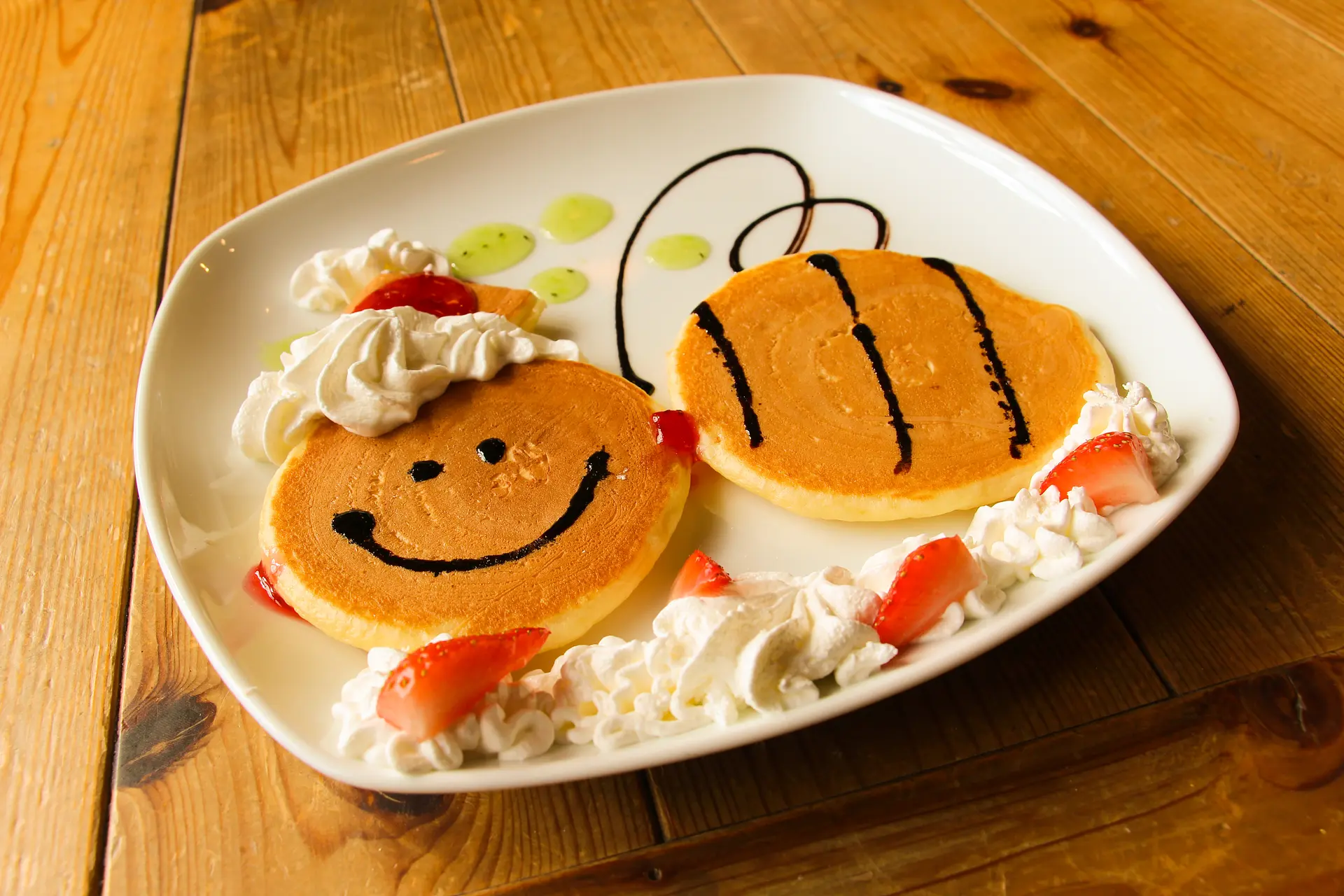 「ぶんぶんのパンケーキやさん」では、甘くて美味しいスイーツ以外にもハンバーグやオムライスなども楽しめますよ。(ぶんぶんのクリスマスサンタパンケーキ 650円)
