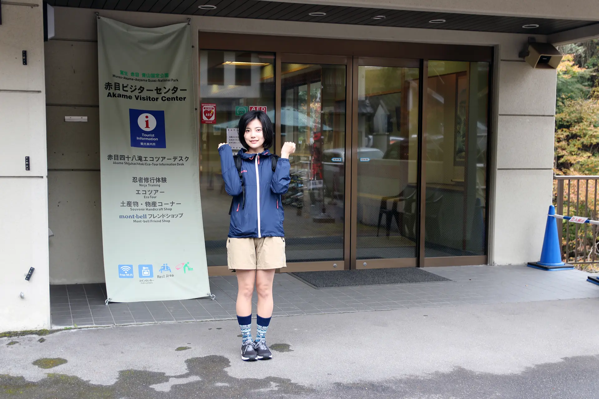 様々な観光情報などをお届けしてくれる赤目ビジターセンター前でパシャり。赤目四十八滝渓谷保勝会、増田さんのガイドの元、さっそくスタートです!