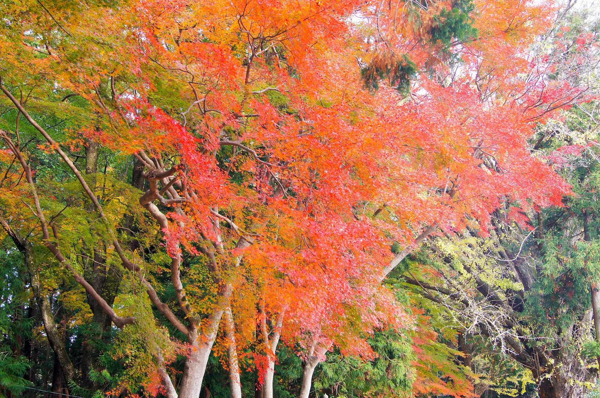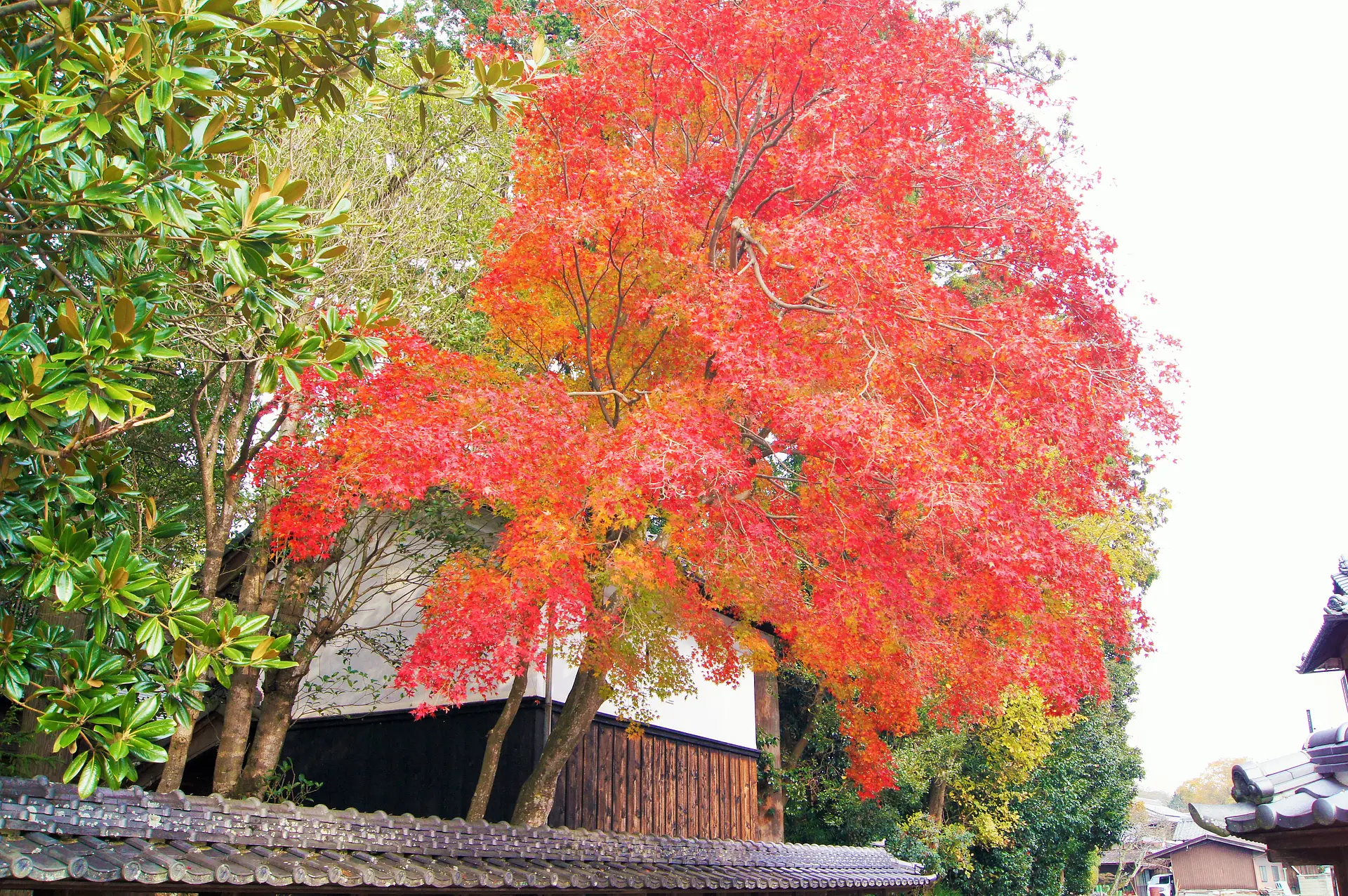 神柿のある森を出て、一般道を歩いていると、神社の境内から顔を出すモミジの木を発見。