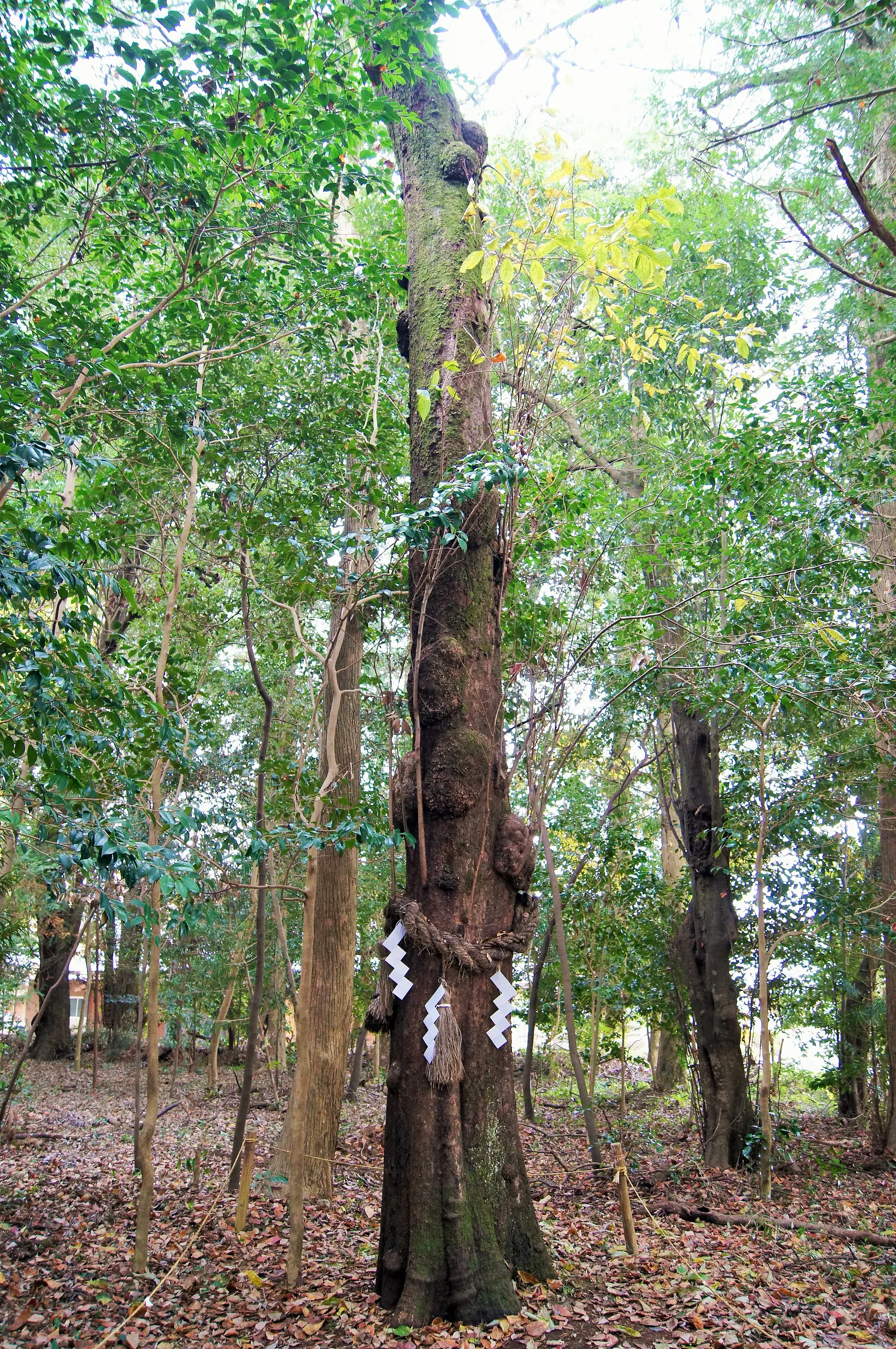 本殿裏の森の中にそびえ立つ「神柿」(かみがき)といわれる巨木。