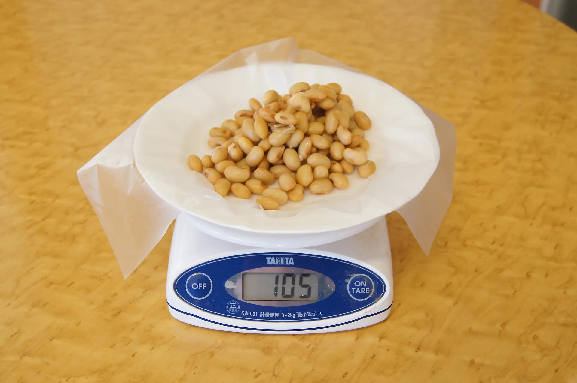 今回の体験の大豆の重さは、100g。でも、量りに載せるのは、105g。