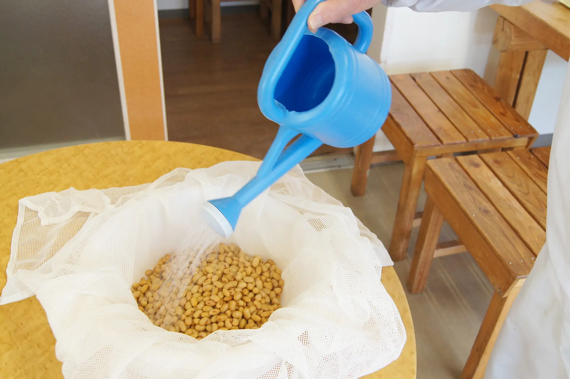 「納豆菌は大豆が大好きなので、大豆を食べてしまうんです。それによって、大豆の重さが減るので、少し多めに量っておきます」とスタッフさん。