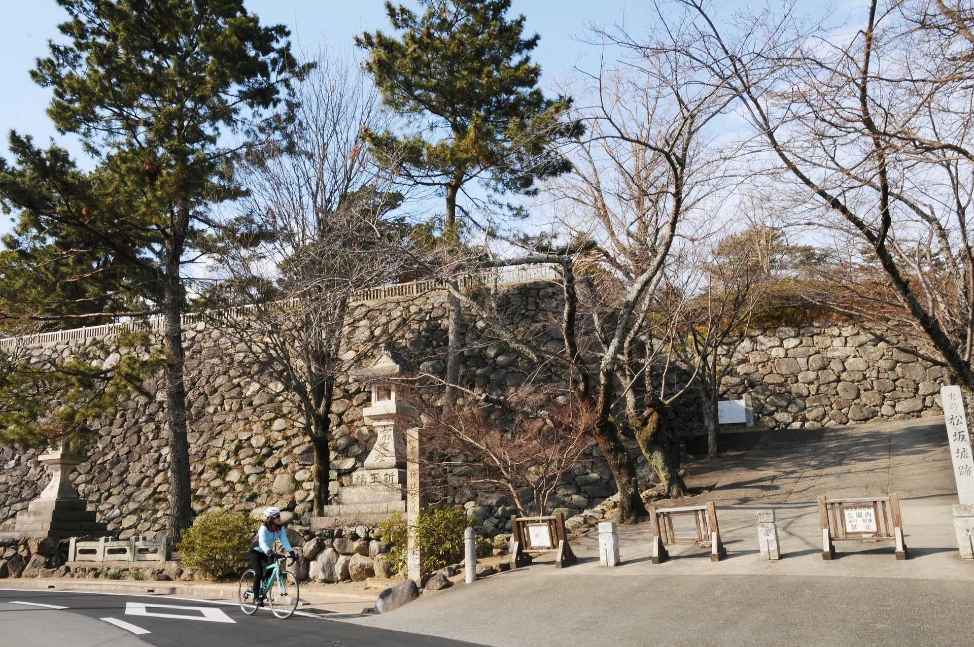 この森を目指して走ると、やがて左手に見事な石垣が見えてきました。松坂城跡に到着です!