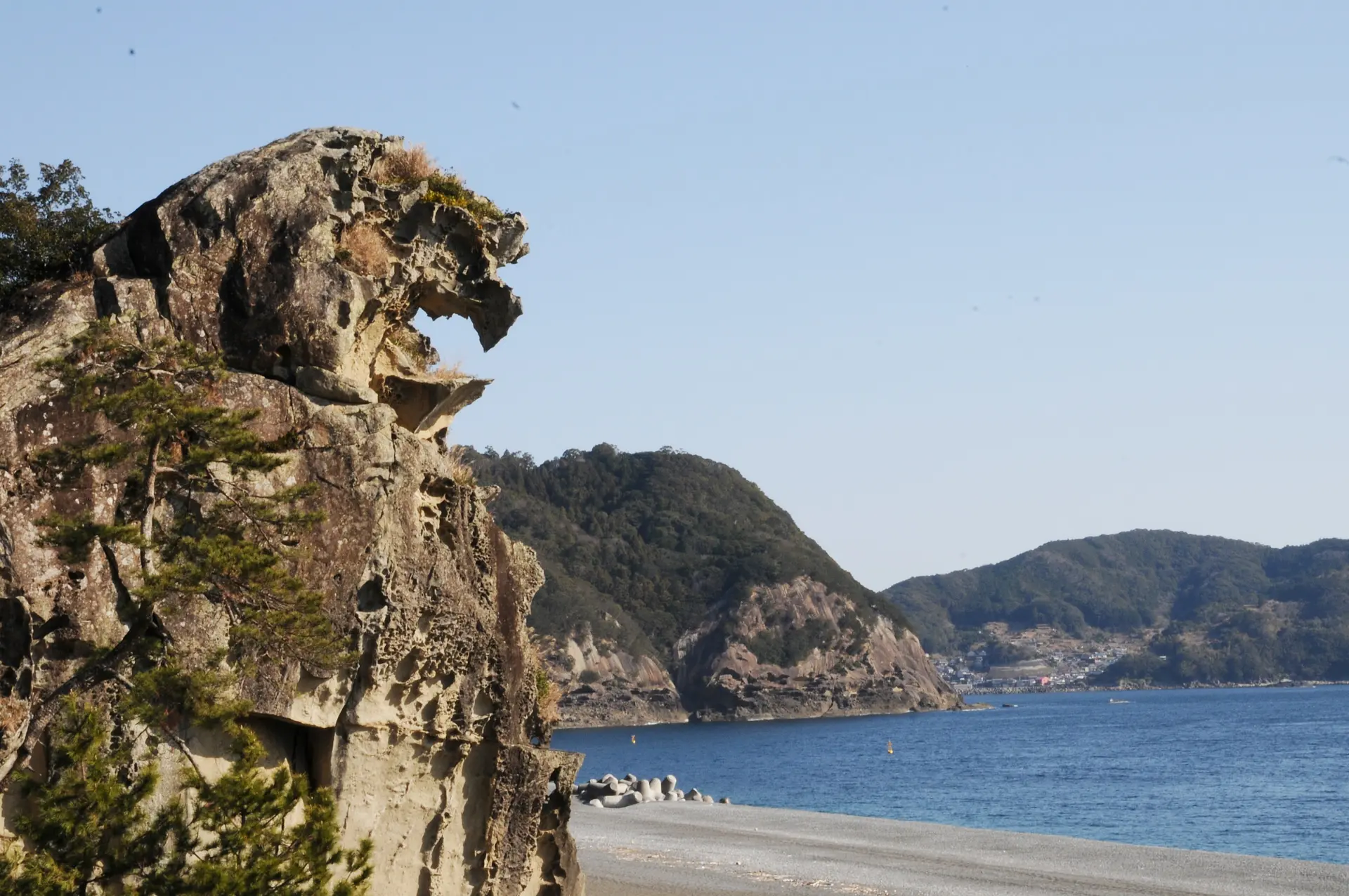 獅子が七里御浜(しちりみはま)に向かって遠吠えしているように見える奇岩で、熊野を象徴する見どころのひとつです。