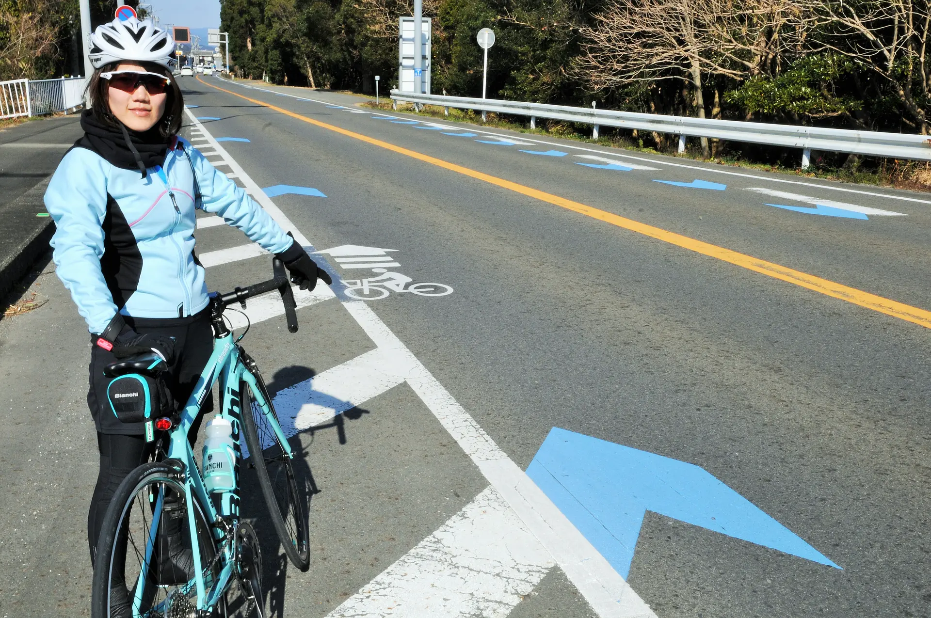 それは交通量が少ないことだけが理由ではなさそうです。車道の左側に一定の間隔で自転車の通行場所と進行方向を示す青い矢羽根がペイントされているのですが、これがドライバーへの注意喚起を促していて、自転車で走る人に優しい運転をする人が多いように感じました。