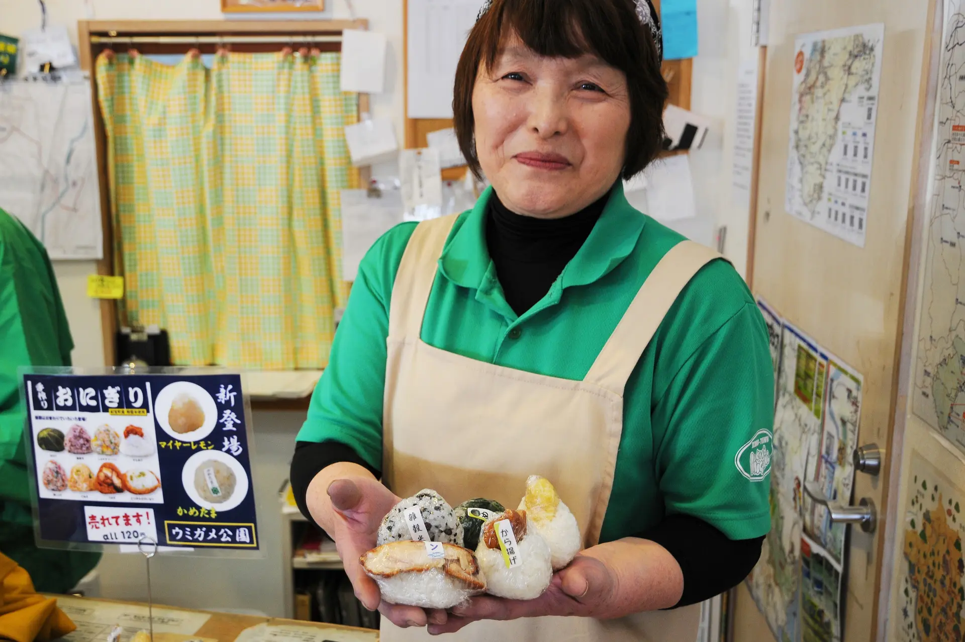「ここには地元の食材を使ったおにぎりがあるんです。お腹もすいたし、お昼にしましょう!」