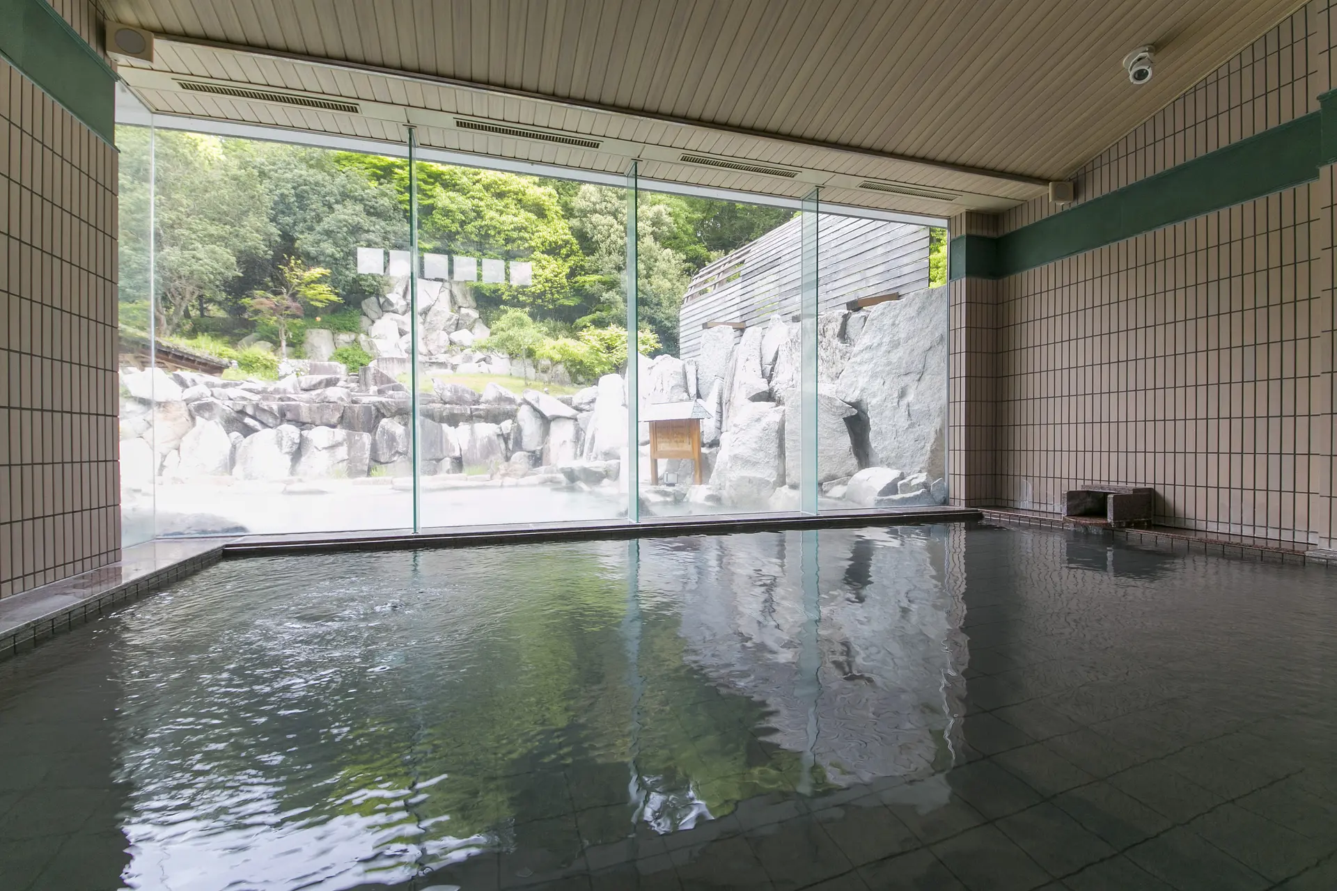 その広さに驚くとともに、開放感もたっぷり!無色透明のアルカリ単純泉の柔らかな湯は、肌に優しく心地よいと、特に女性に評判です。