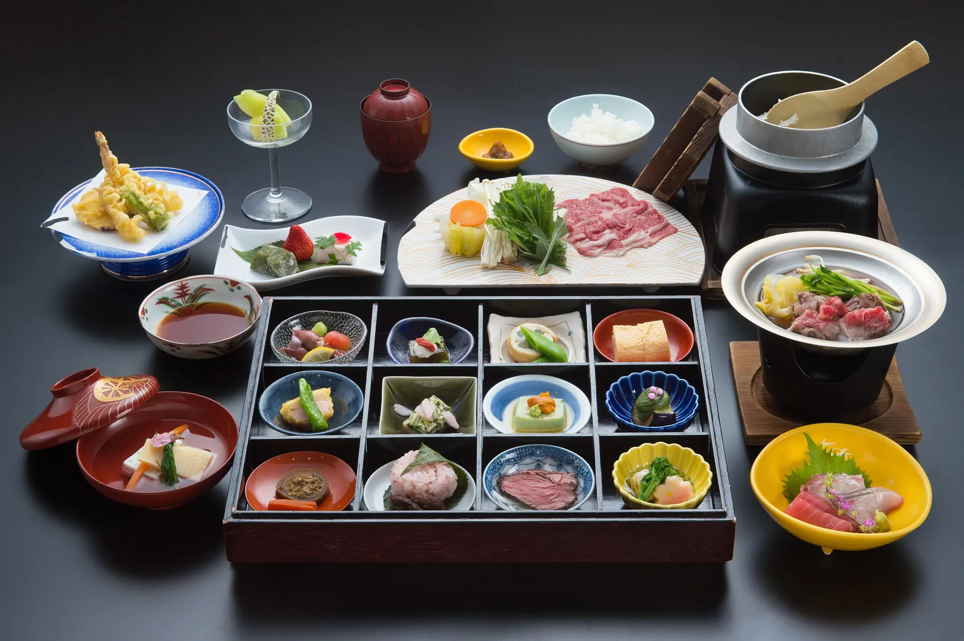 料理は、季節ごとに伊賀の食材を幅広く楽しめるように、「創作和食」と「フレンチ」から選ぶことができます。和食のレストラン「バンブーテラス」は、竹をあしらった庭園を眺められる造りになっています。
